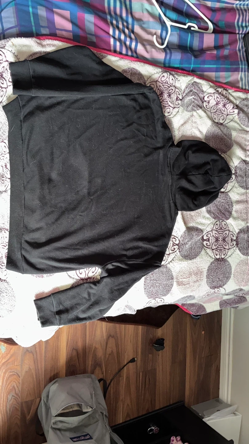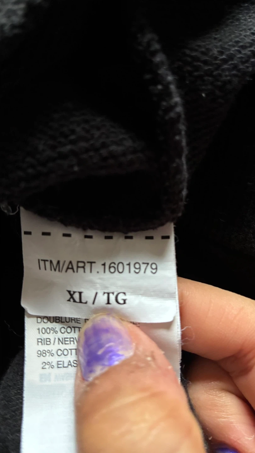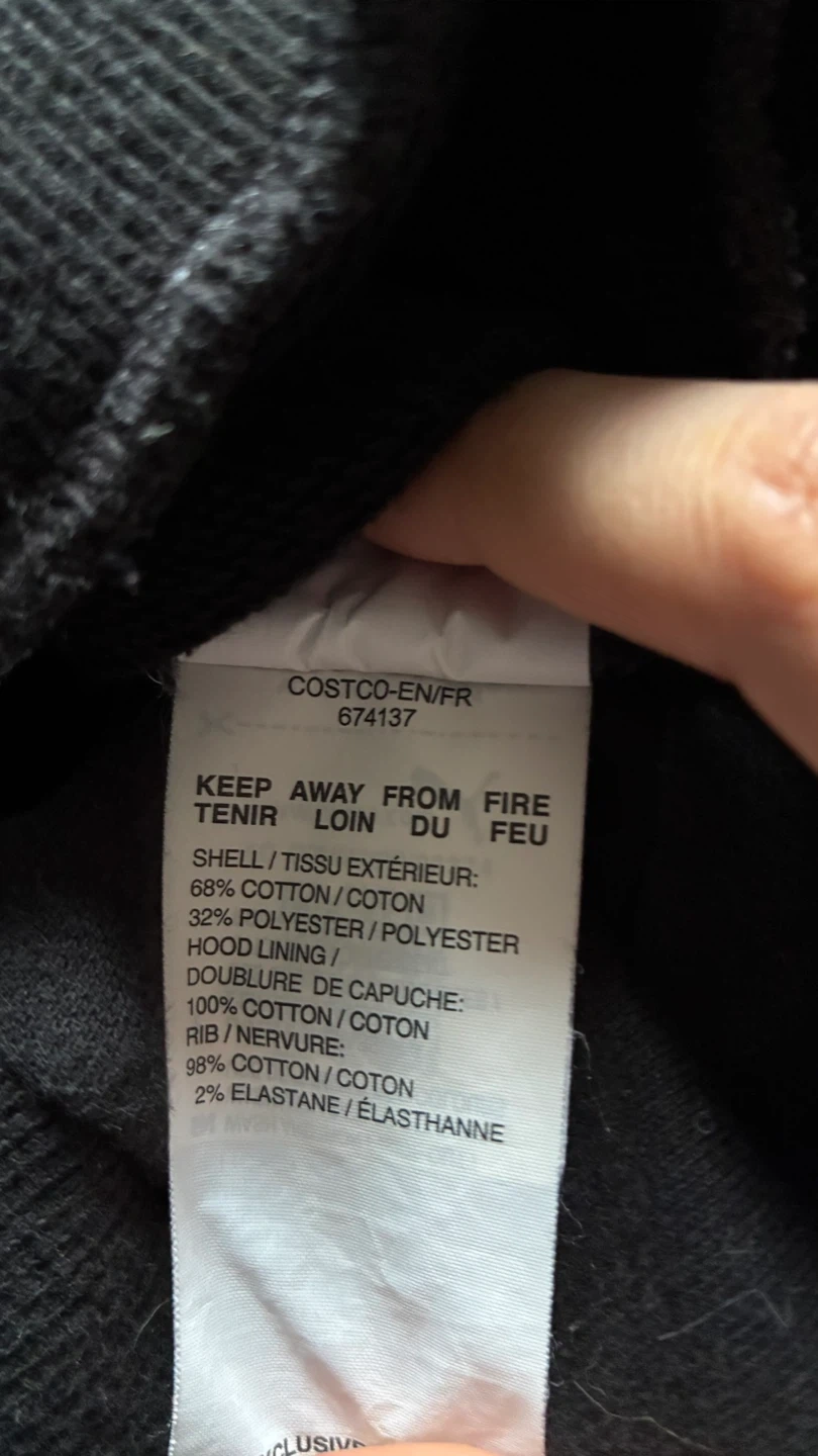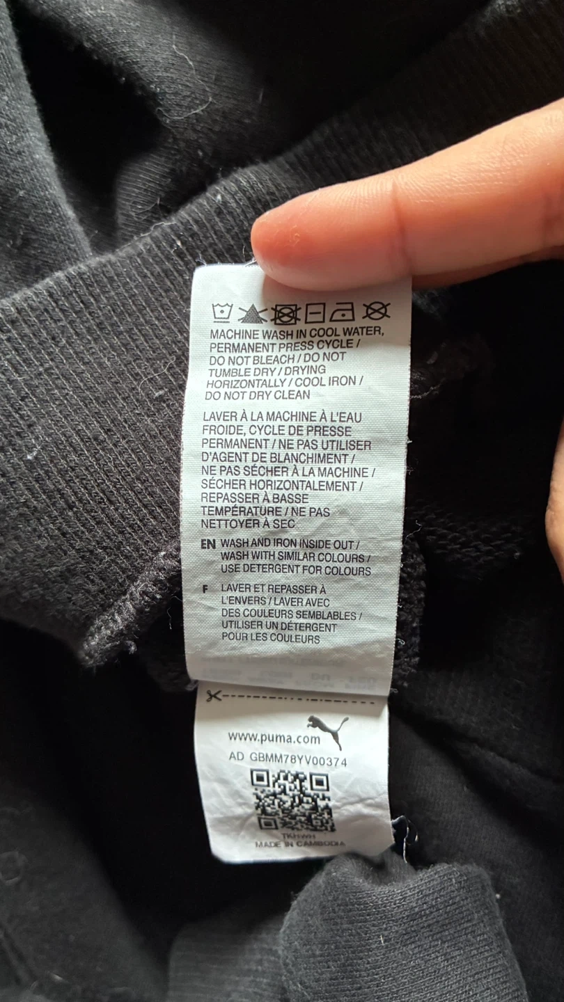 Black Puma hoodie with white and pink PUMA graphic on the front. Shell is 68% cotton and 32% polyester. Hood lining is 100% cotton. Ribbing is 98% cotton and 2% elastane. Size is XL. From Costco