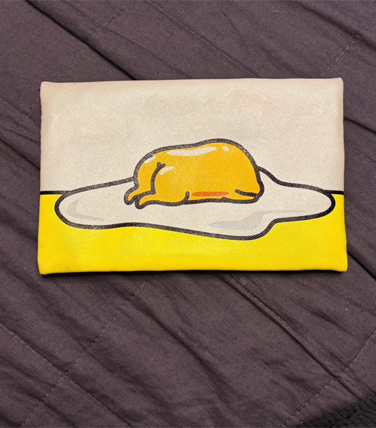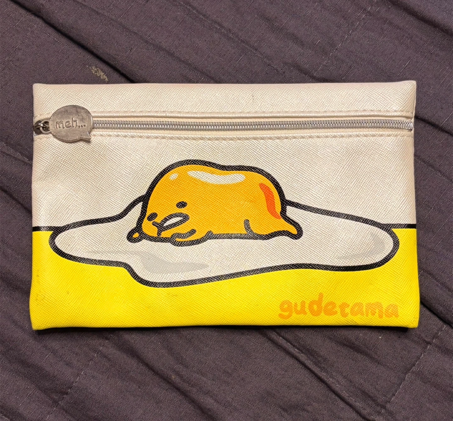 This Sanrio Gudetama zippered pouch is perfect for storing small essentials. It features the iconic lazy egg character on a yellow background. The interior lining is bright yellow and it has a "meh..." zipper pull. It's a fun and practical accessory for any Sanrio lover! Pickup on Astoria Blvd South and 38th Street.