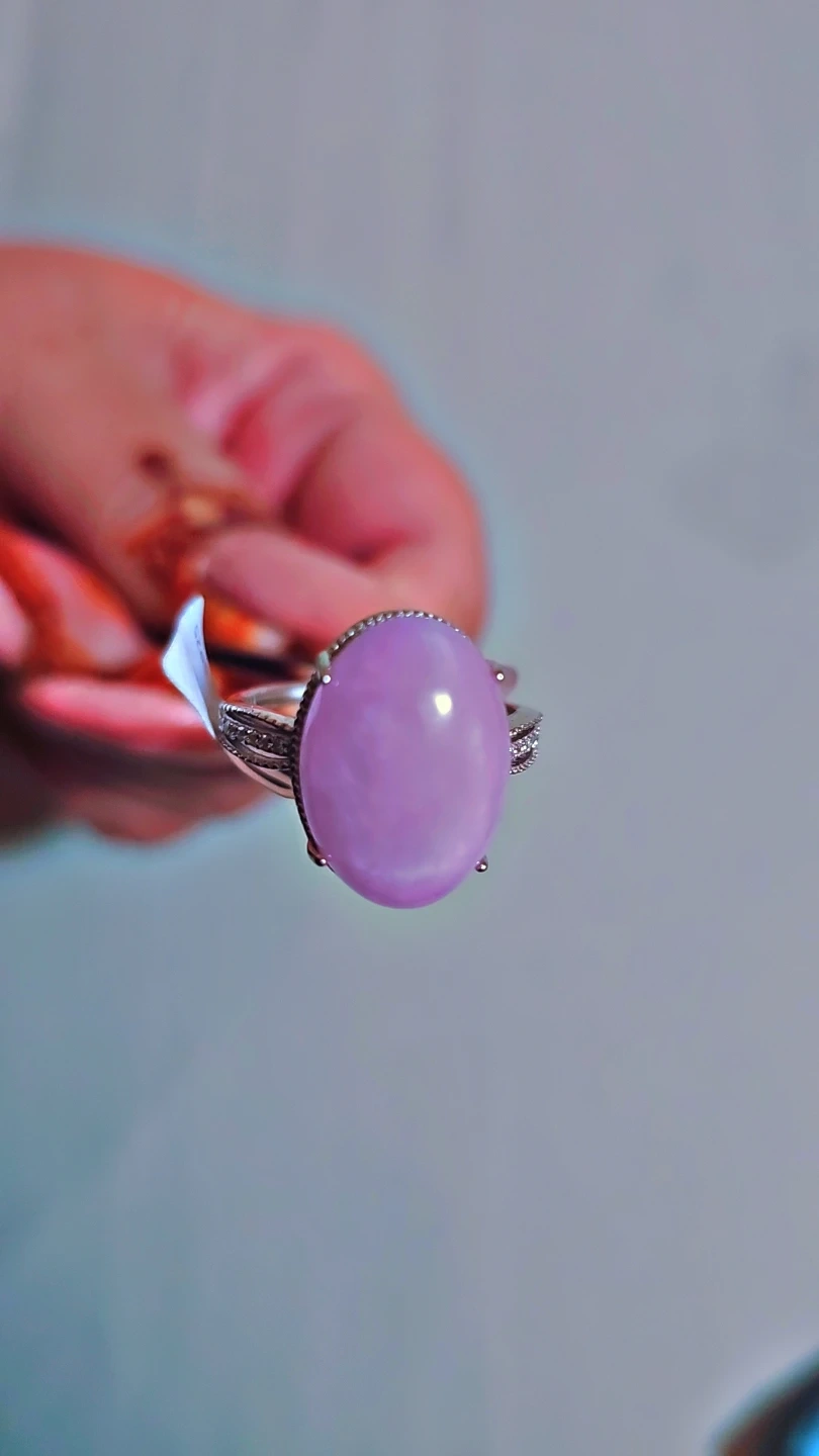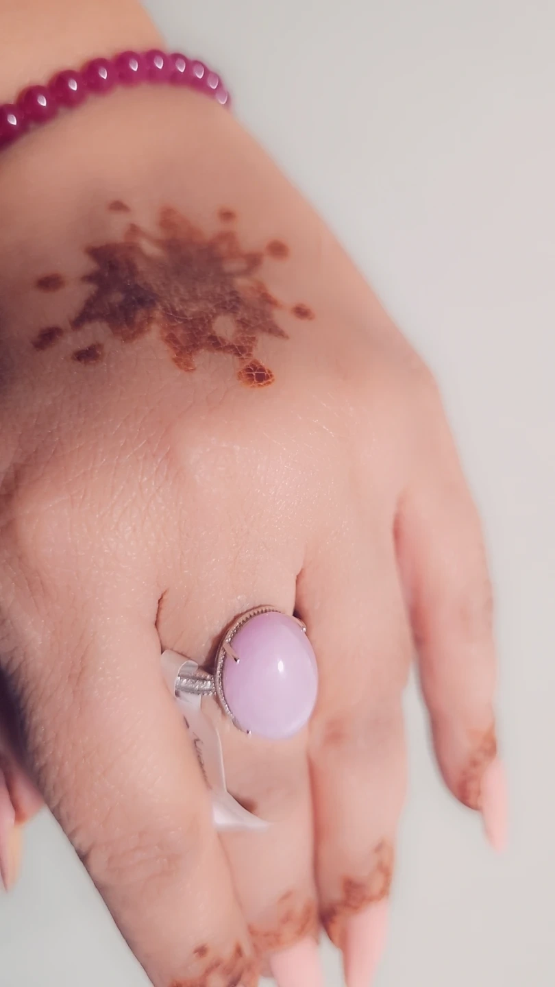 This beautiful ring features a large, smooth pink purple kunzite gemstone set in a sterling silver S925 band. It's accented with small, clear stones around the main gem. The band has a lovely textured detail. It's a real eye-catcher! -Spiritual: Opens the heart chakra connects mind and heart promotes divine love, kindness, and self-worth.