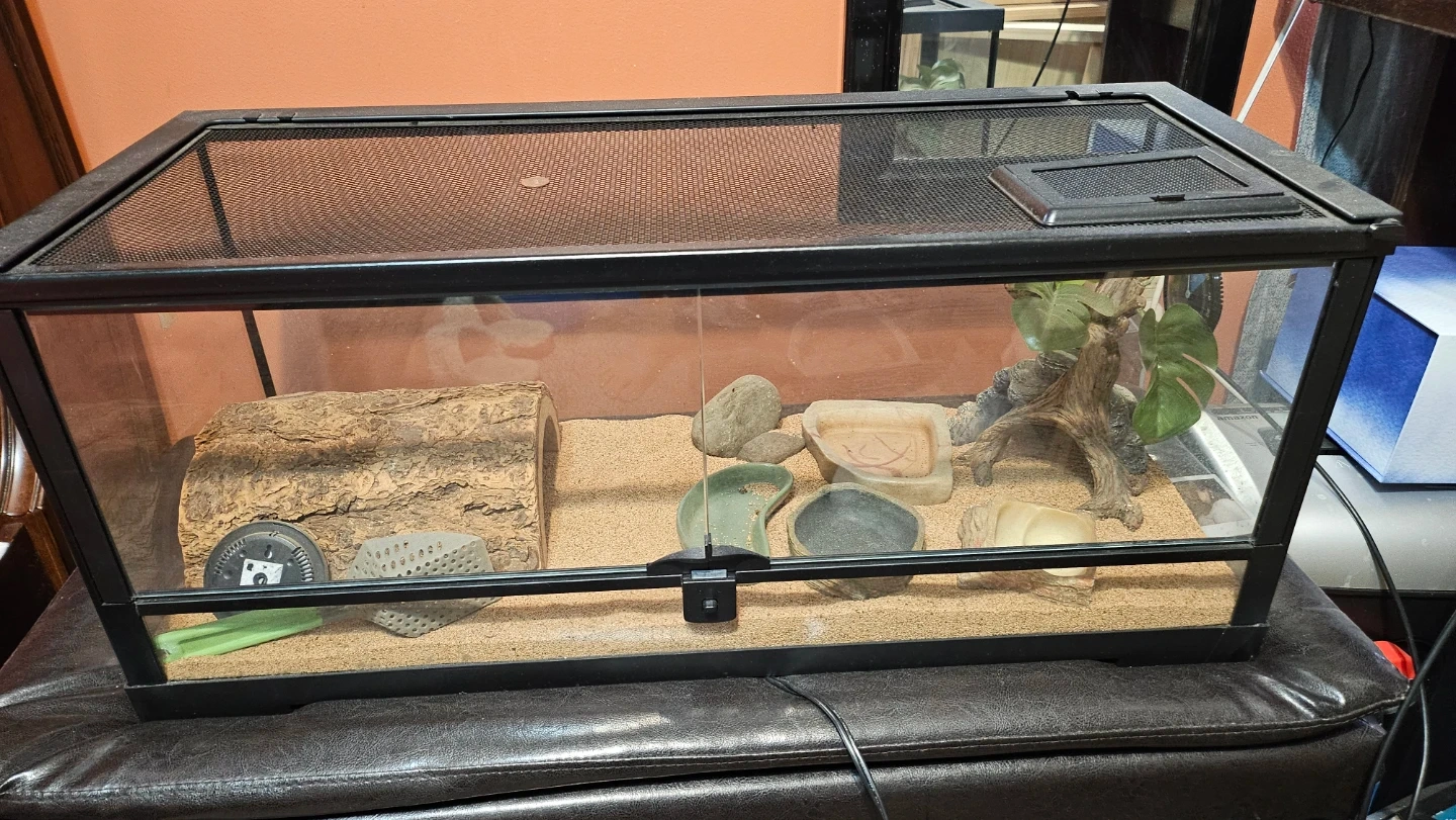 This is a glass terrarium enclosure suitable for reptiles or small animals. It comes with substrate, a thermometer, a log hide, and water dishes. The top has a mesh lid for ventilation. It's ready for your pet!