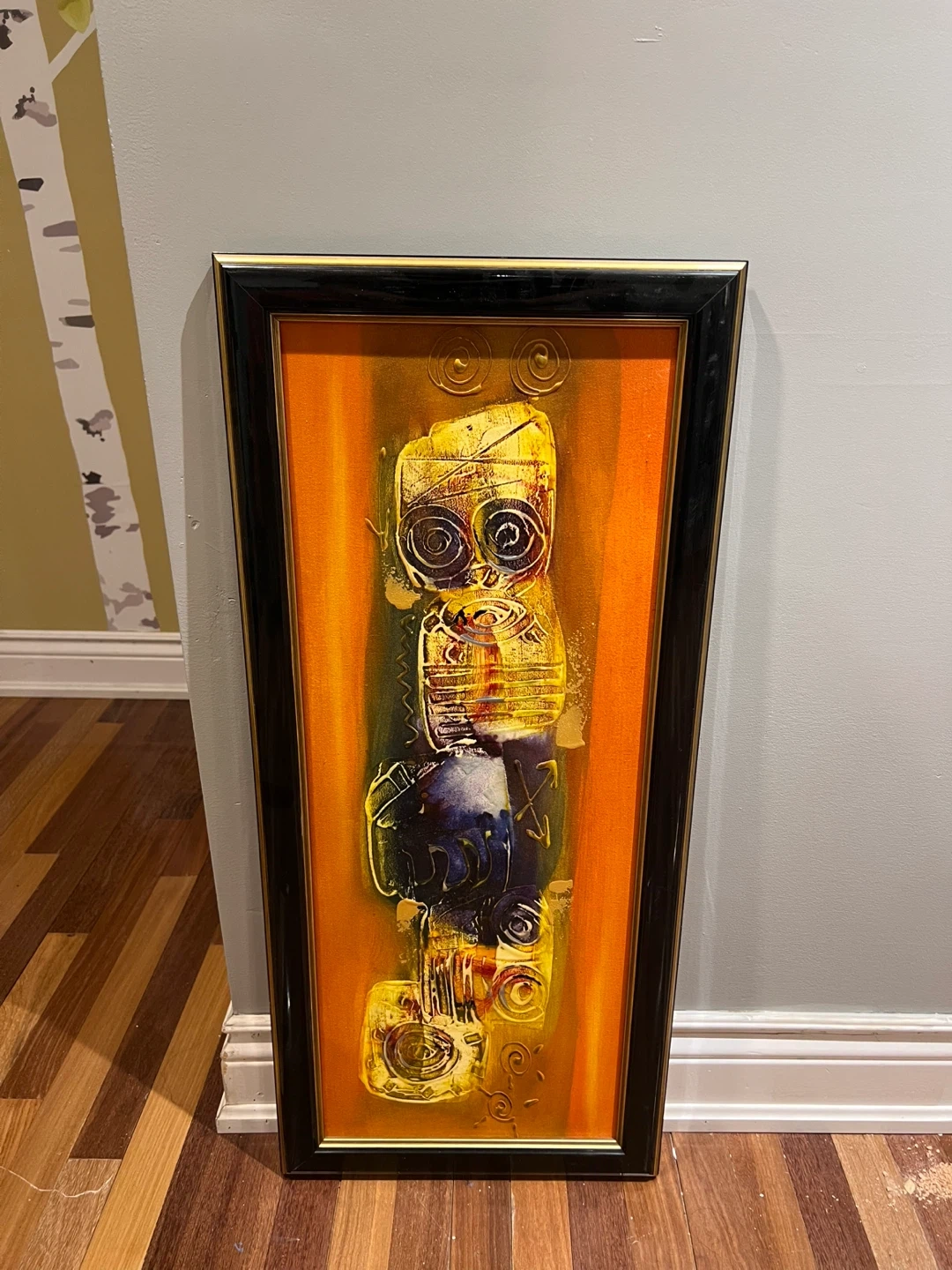 This framed piece features vibrant abstract artwork with a mix of yellow, orange, and blue tones. It's ready to hang and add a pop of colour to any room! The art is set in a sleek black frame.