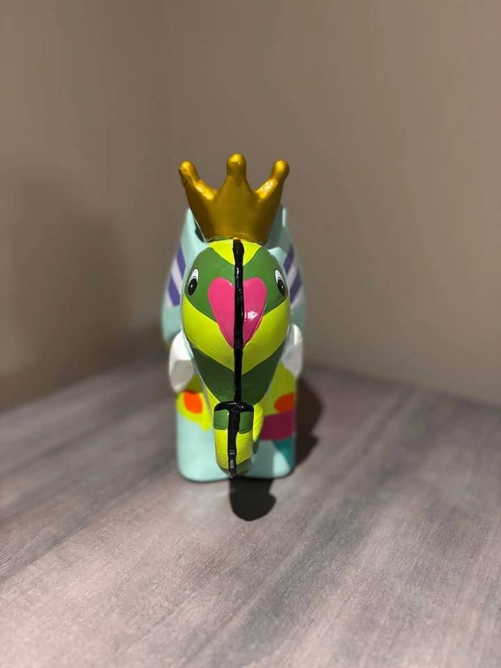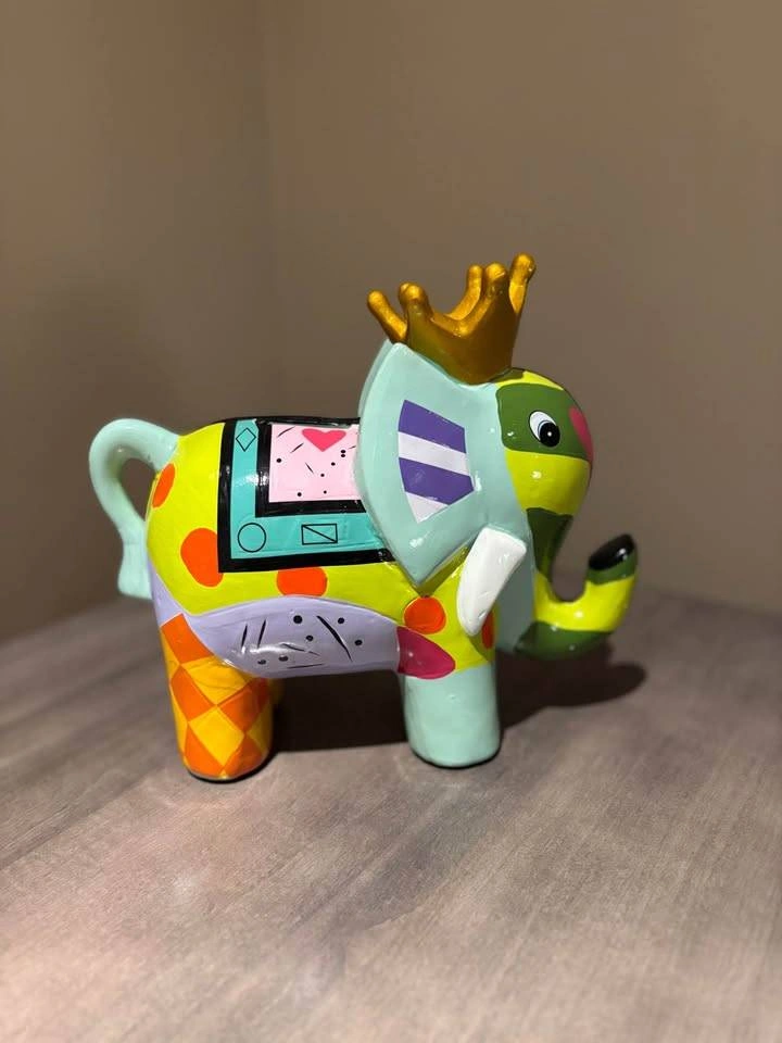 Cute and colourful elephant figurine. Hand-painted design. Features a gold crown. Small size, perfect for a shelf or desk.