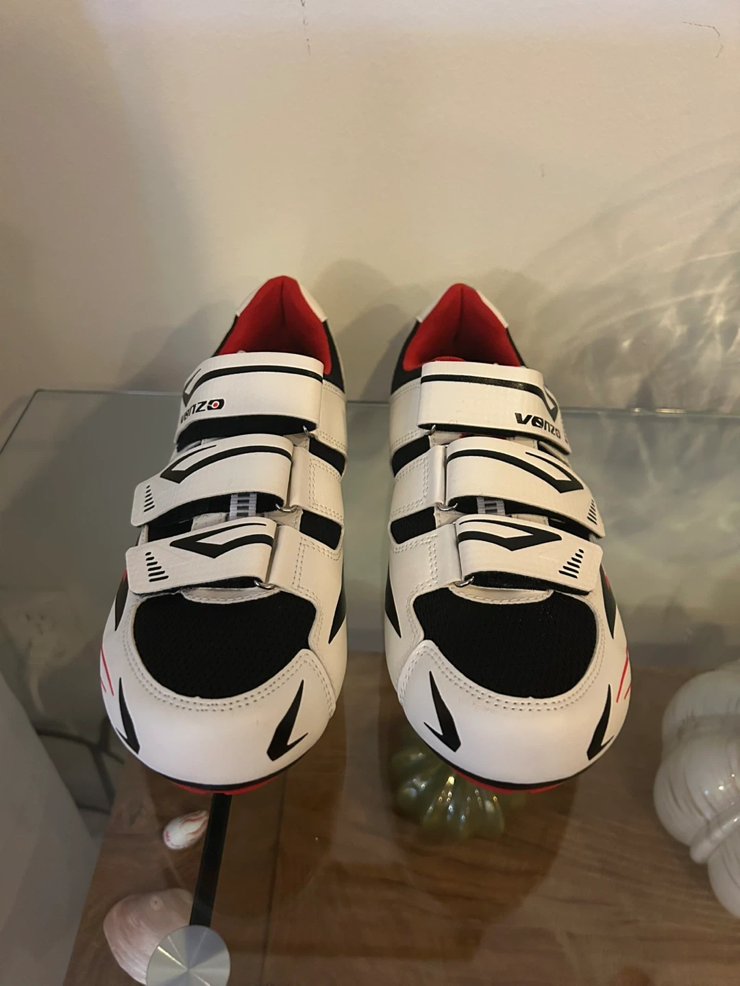 White and black Venzo cycling shoes with red accents. Features adjustable strap closures for a secure fit. Includes cleats. Size 9