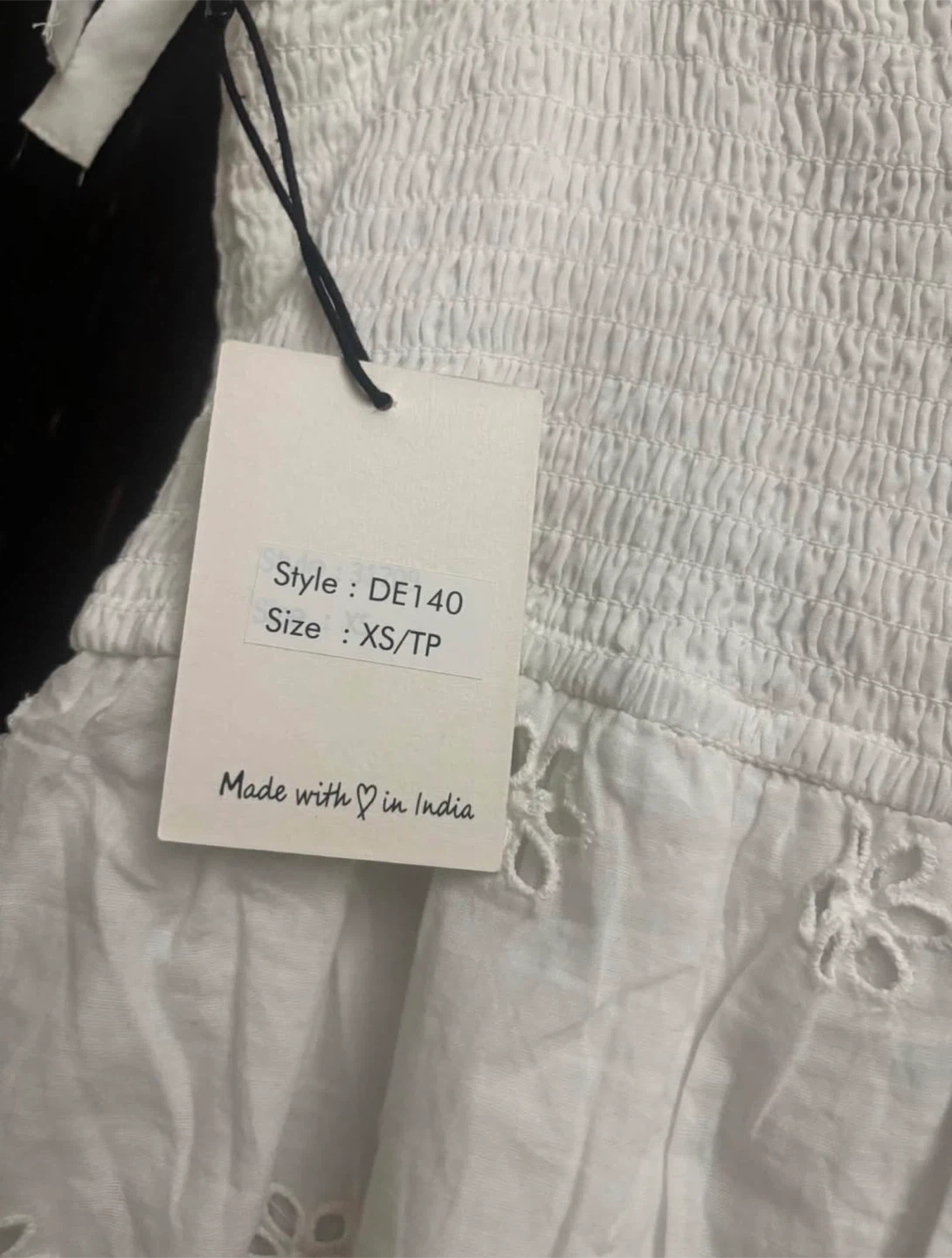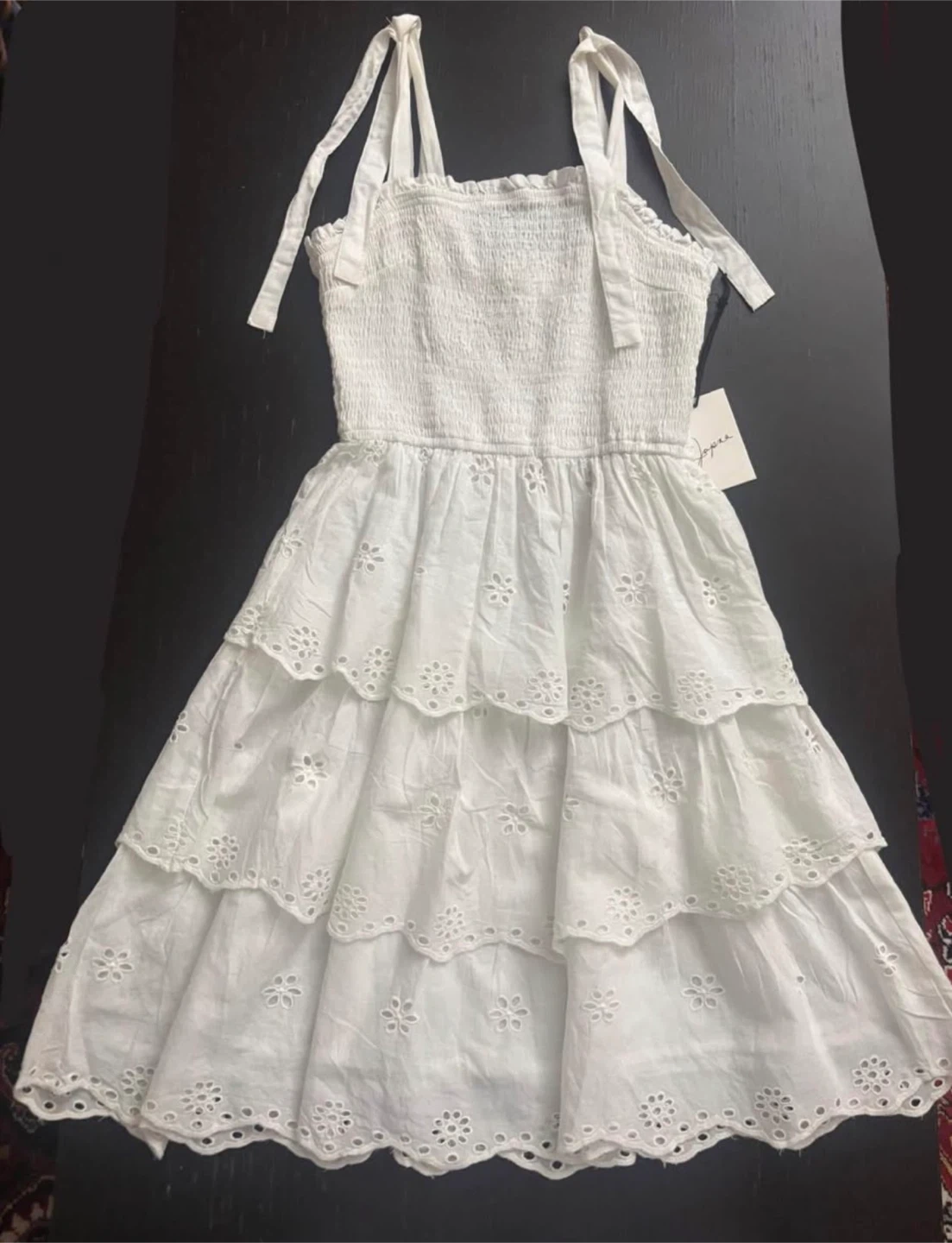 This white dress features a smocked bodice and tiered skirt with eyelet detailing. It's made with cotton and has tie straps. Perfect for summer. Brand new with tags!