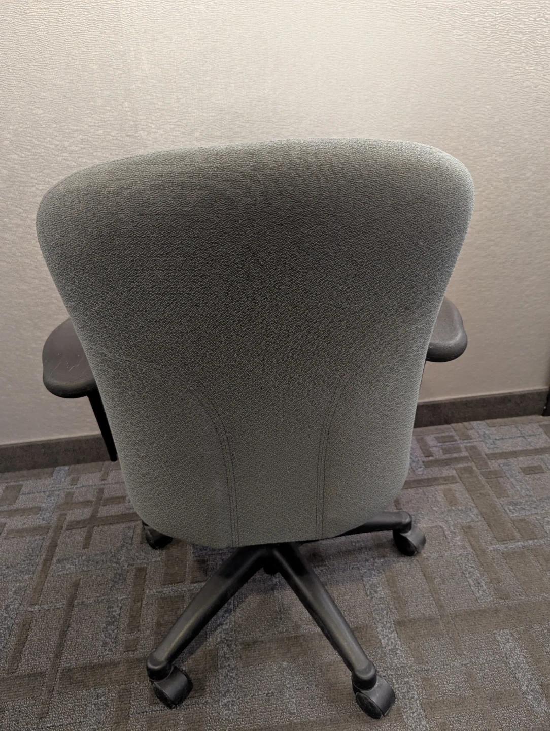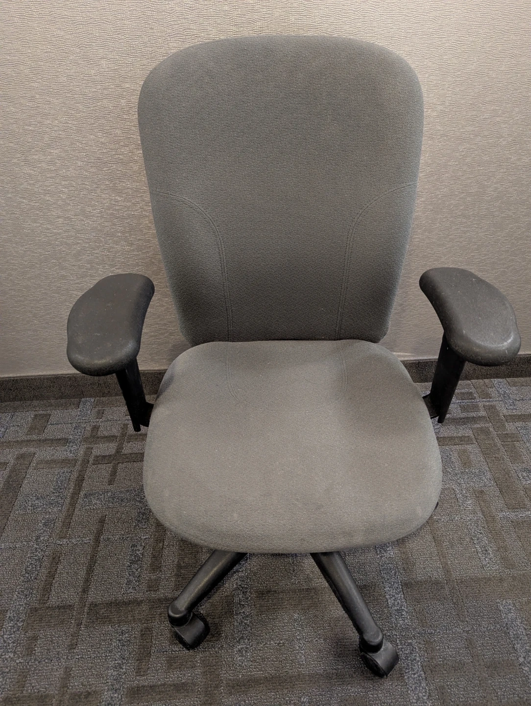 This is a grey fabric office chair with adjustable armrests and a black swivel base. It's designed for comfortable seating. Perfect for a home office setup!