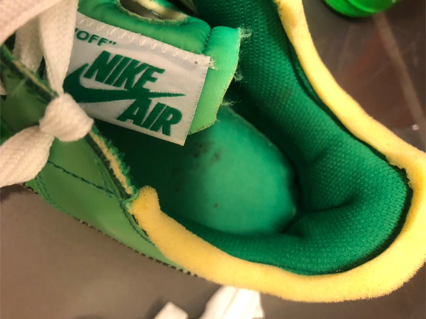 These Nike Air Force 1 shoes are a vibrant green colour. They feature white laces and the classic Nike Air sole. These sneakers are perfect for adding a pop of colour to any outfit.