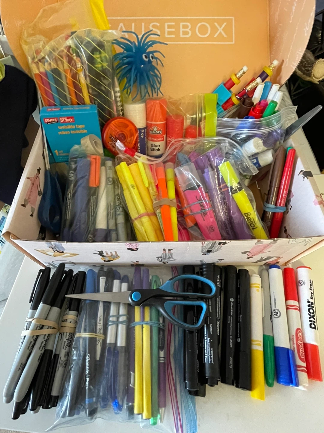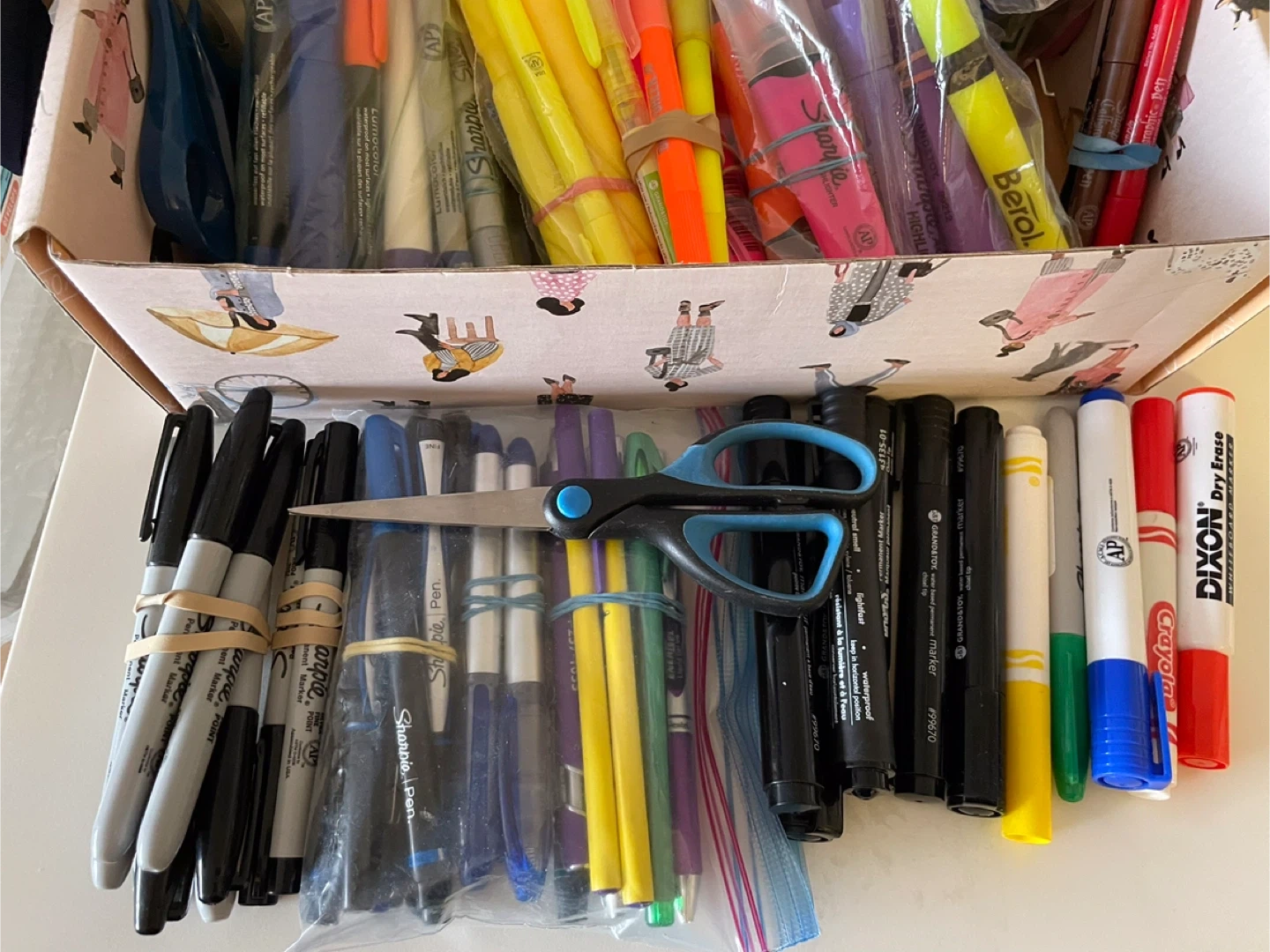 A collection of pens, markers, highlighters, pencils, and glue sticks. Includes scissors, tape, and a correction tape. Lots of Sharpies in 3 sizes are also included. New and like new.