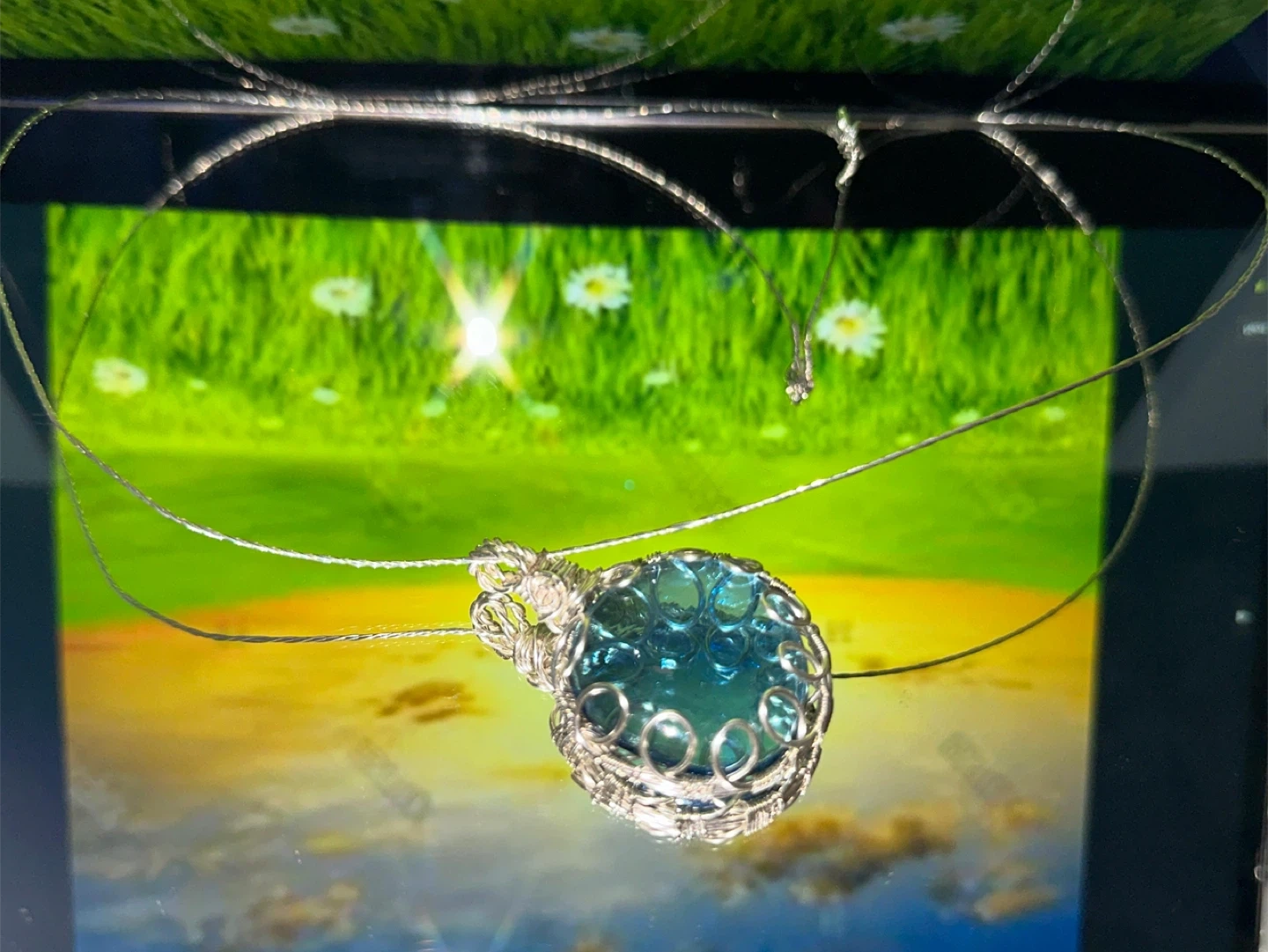 This unique pendant features a striking blue stone, intricately wire-wrapped in silver-toned metal. It hangs from a delicate silver-tone chain. A beautiful piece for adding a pop of color!