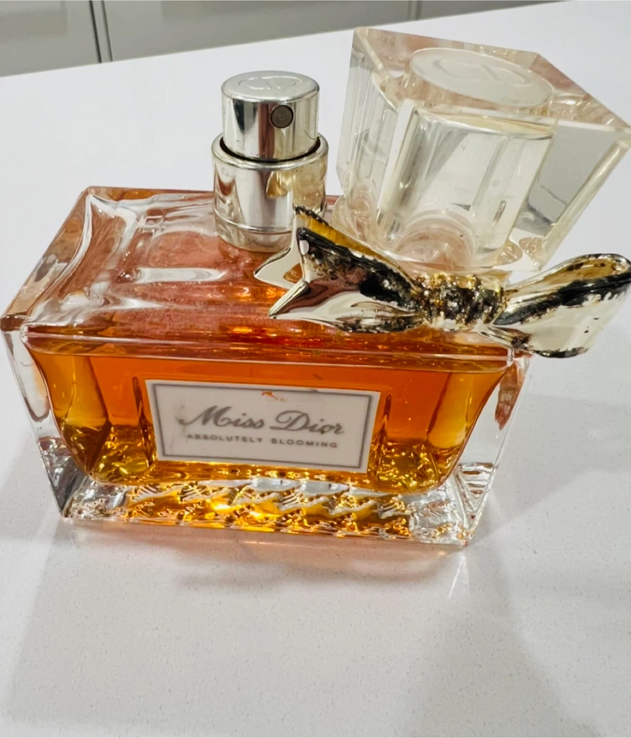 Dior Miss Dior Absolutely Blooming Eau de Parfum. This fragrance comes in a beautiful glass bottle adorned with a silver bow. It's a floral and fruity scent.