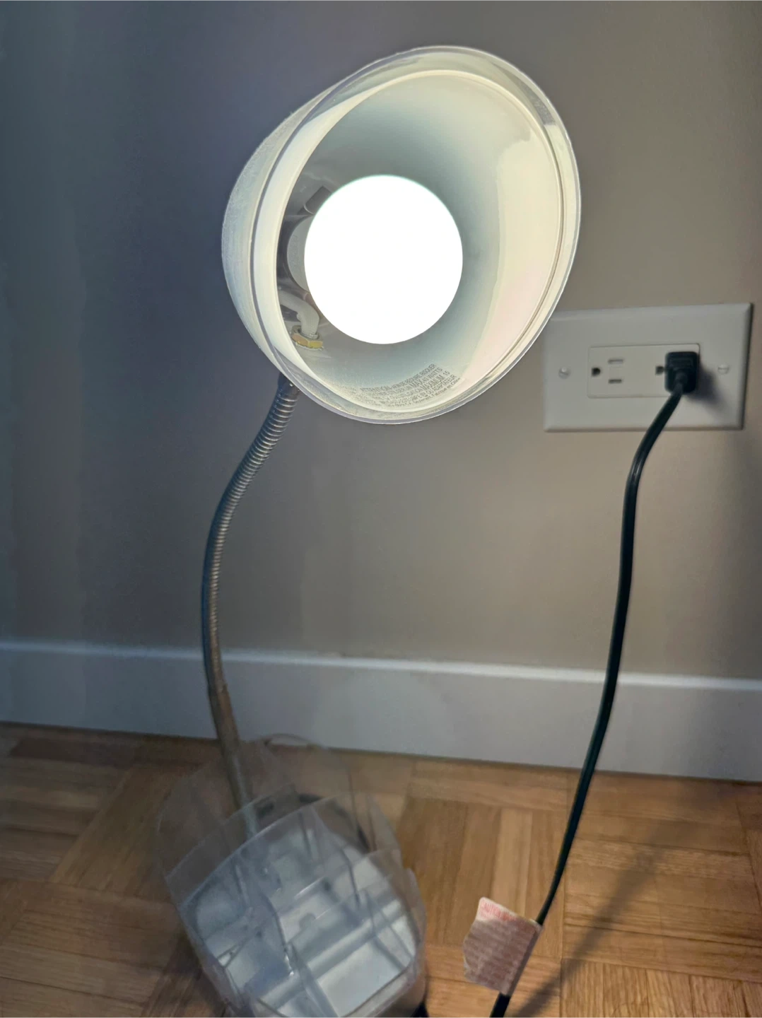 This desk lamp features a flexible gooseneck and a frosted shade for diffused lighting. It's got a handy organizer base with multiple compartments. A bulb is included and it's plugged in and working fine! Great for a workspace or bedside table.