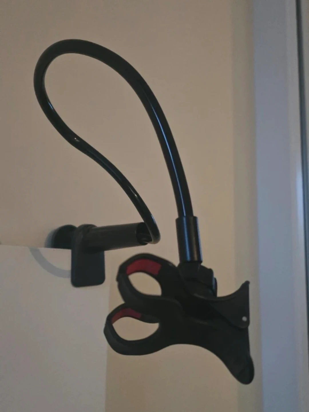 This clip-on phone holder features a flexible gooseneck arm. It clamps onto surfaces securely and holds your phone in place. Great for hands-free viewing at different angles!