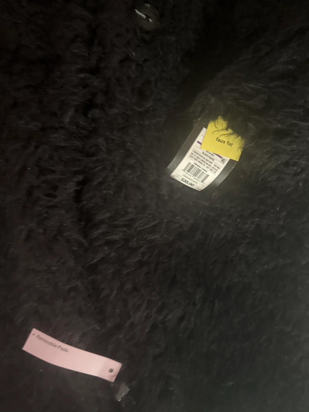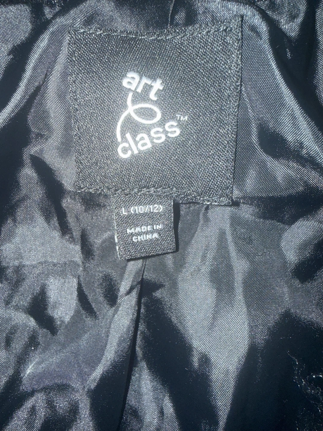 This is an Art Class black faux fur coat. It's a size L, fitting 10/12. The coat has removable pads. It's made of faux fur and has a button closure.