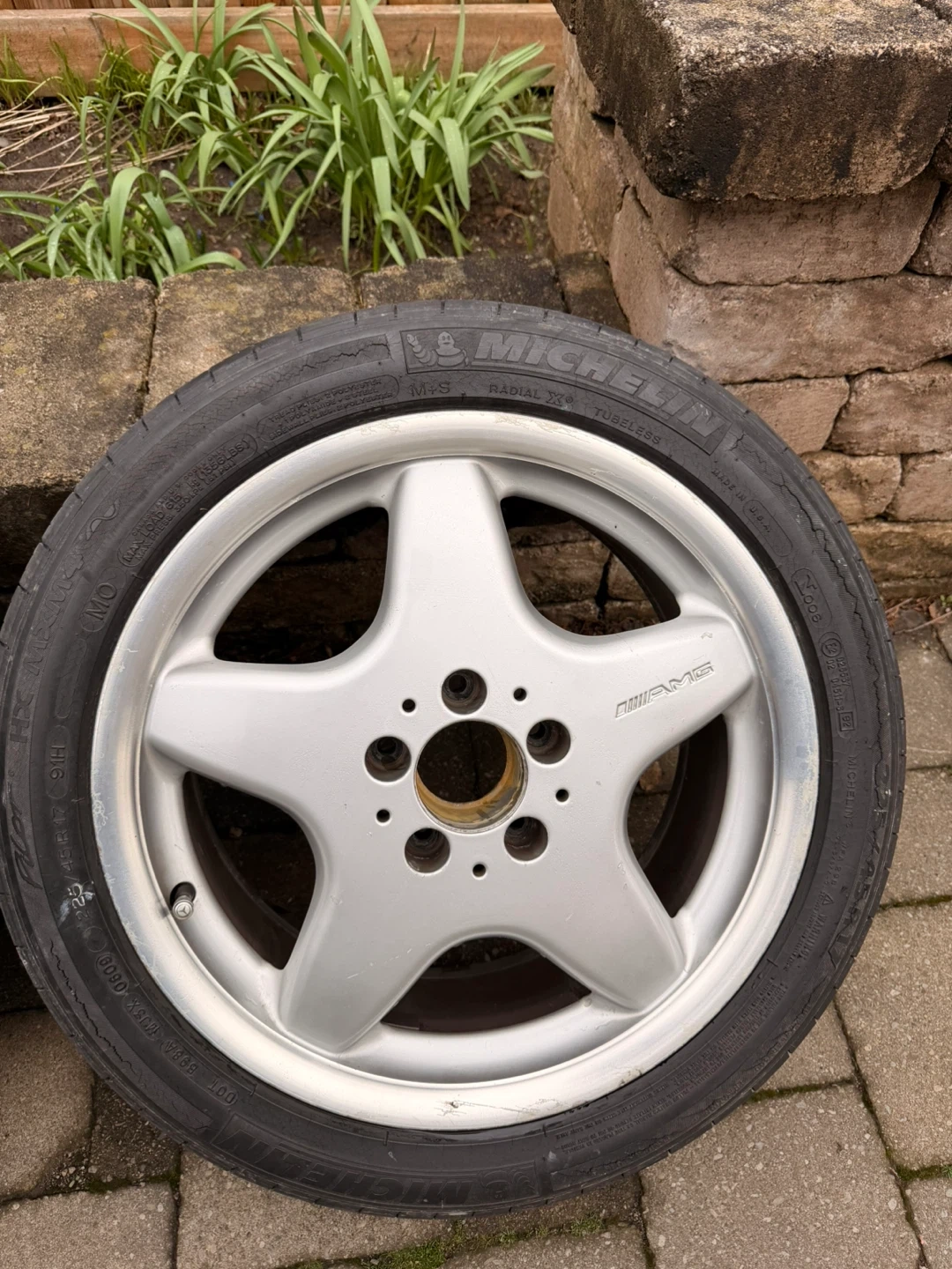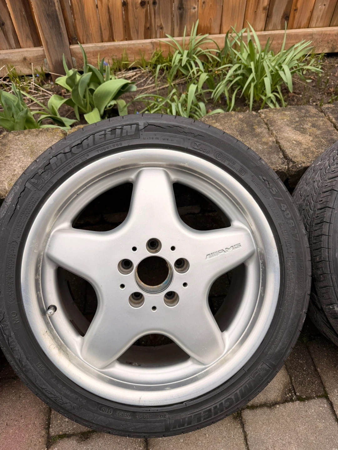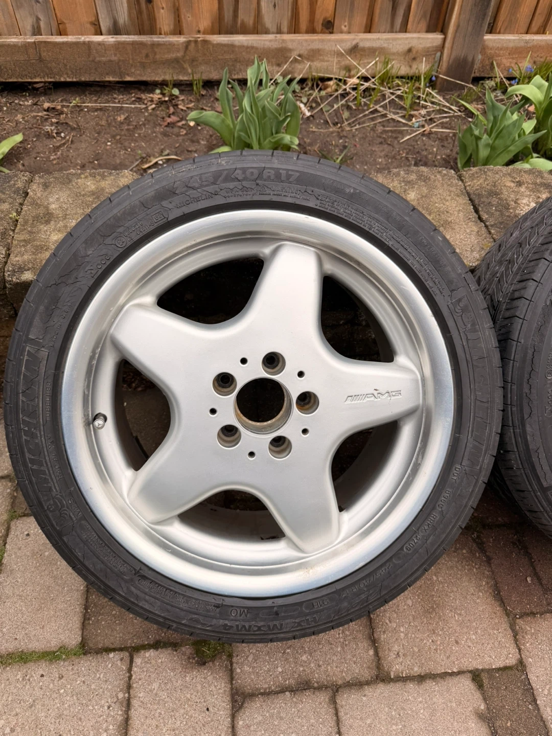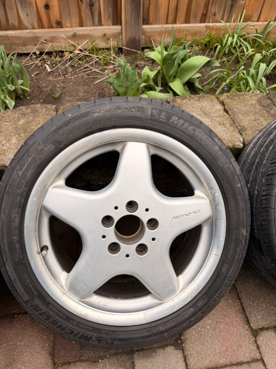 These are 17-inch wheels with a 5-spoke AMG design. Tires are size 225/45R17. I stored them for 4 years, almost every rim is good expect one is lil scratched.