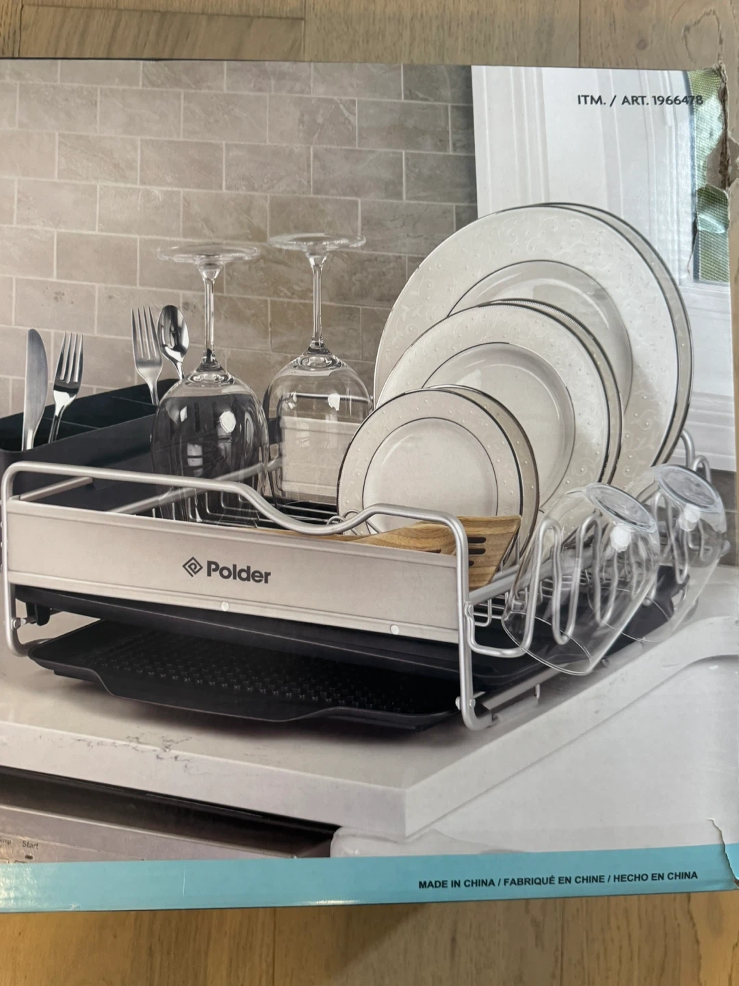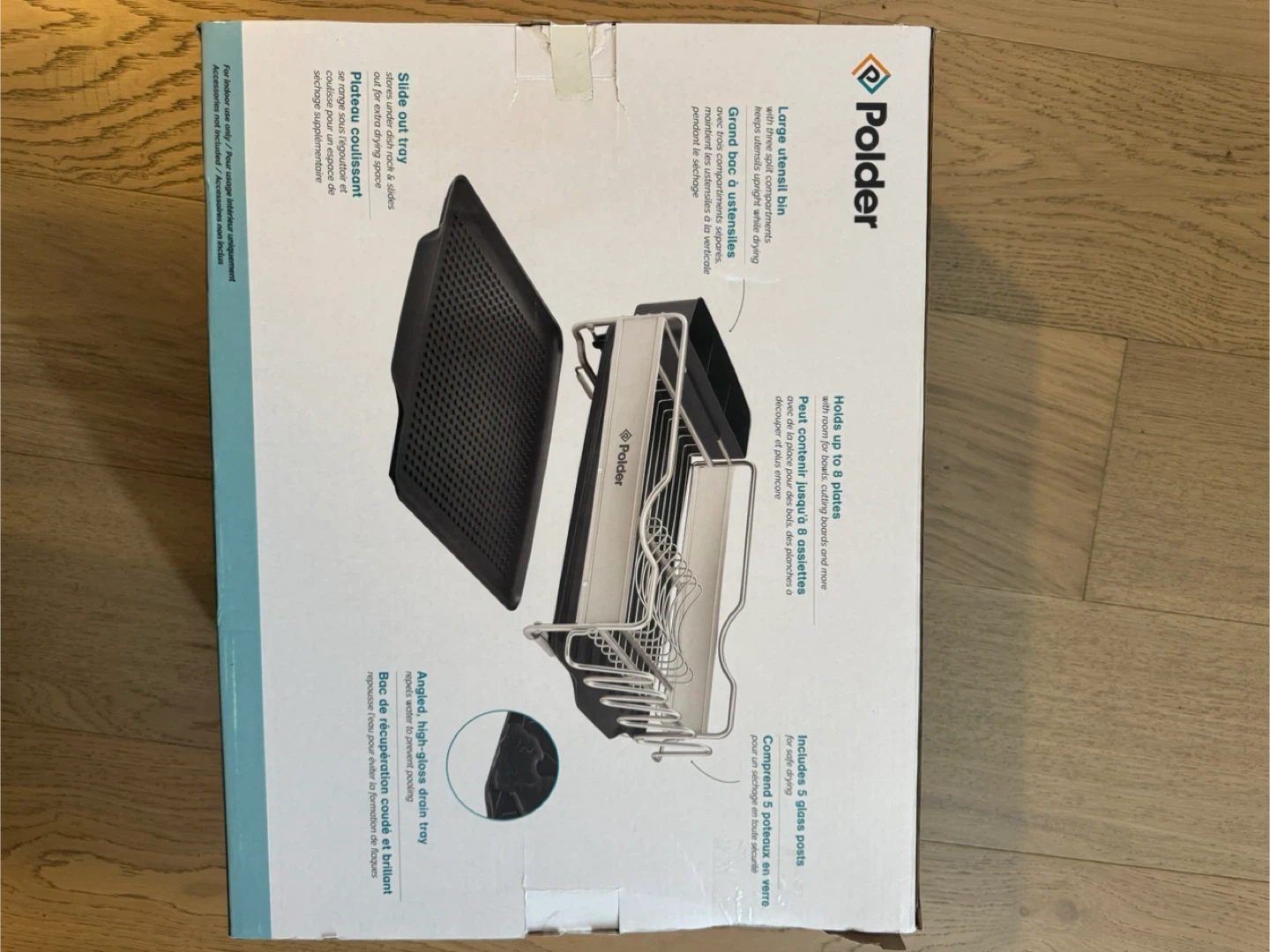 This Polder dish rack is made of Advantage Aluminum and includes a large utensil bin. It holds up to 8 plates and comes with 5 glass posts for safe drying. It also features an angled, high-gloss drain tray.