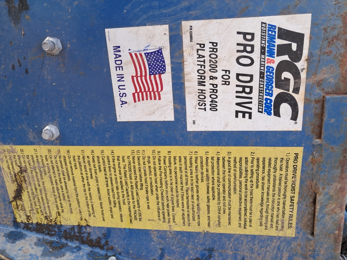 This is a Reimann & Geiger Corp PRODRIVE Platform Hoist for PRO200 & PRO400 models. It has a lifting capacity of 200 lbs with PRO200 and 400 lbs with PRO400. This unit is made in the U.S.A. and is designed for construction use. Roofers...etc...1000 o.b.o. or consider trade for?