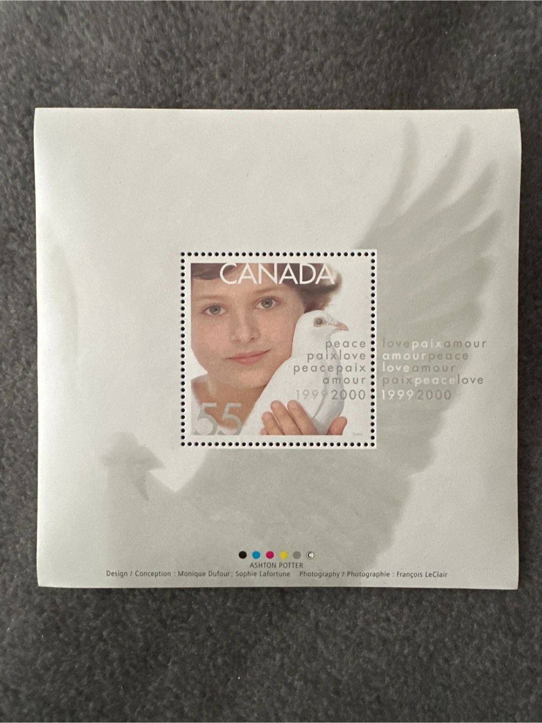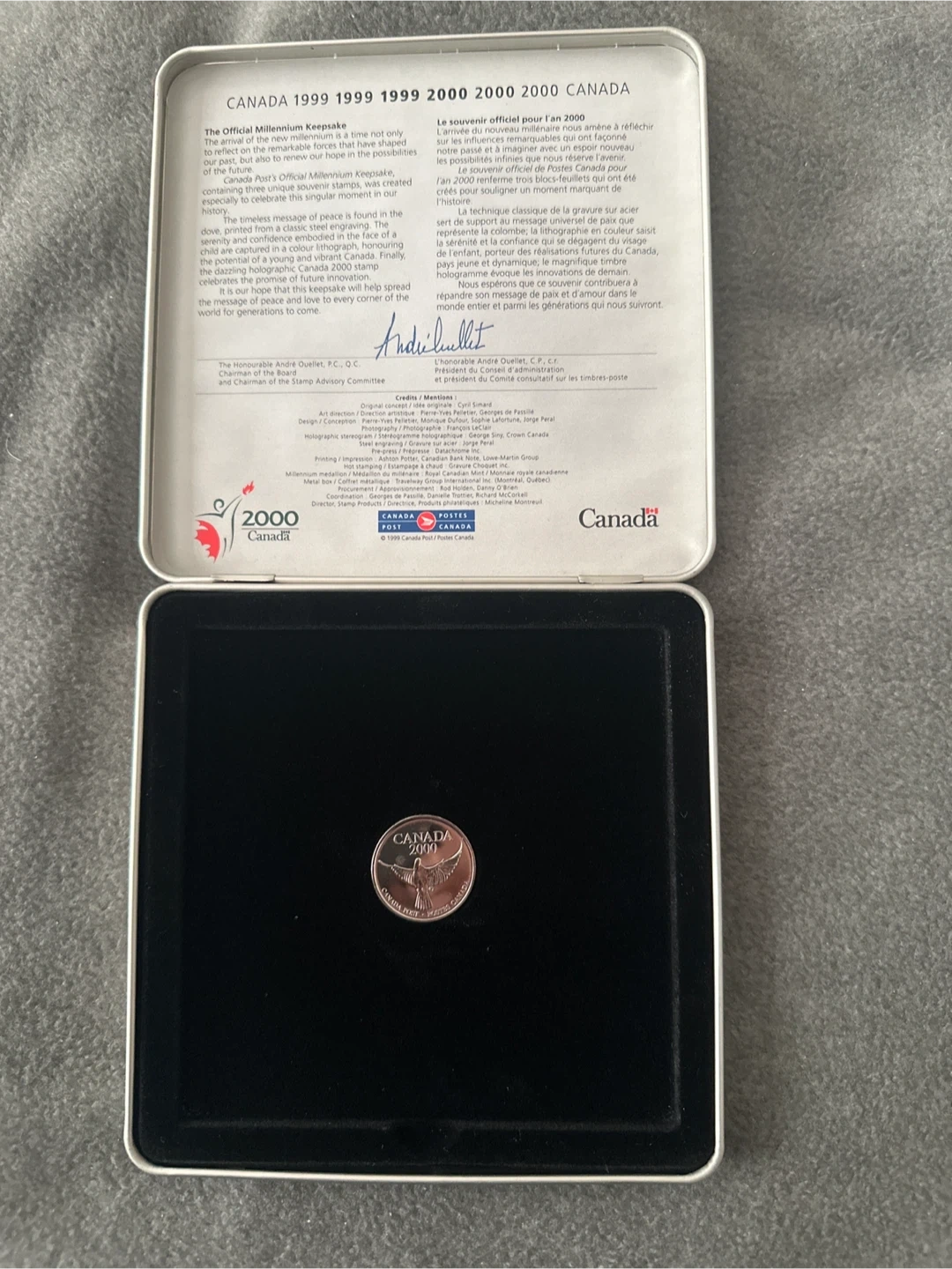 This is a 1999 Royal Canada Mint limited edition Millenium medallion in an exquisitely crafted metal box. The package features an embossed dove design on the lid, and includes mint postage stamps. Postcard included, as well as original Blue Dove cover.