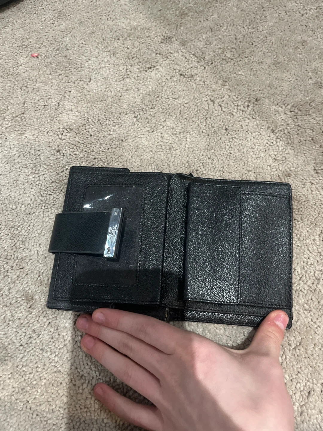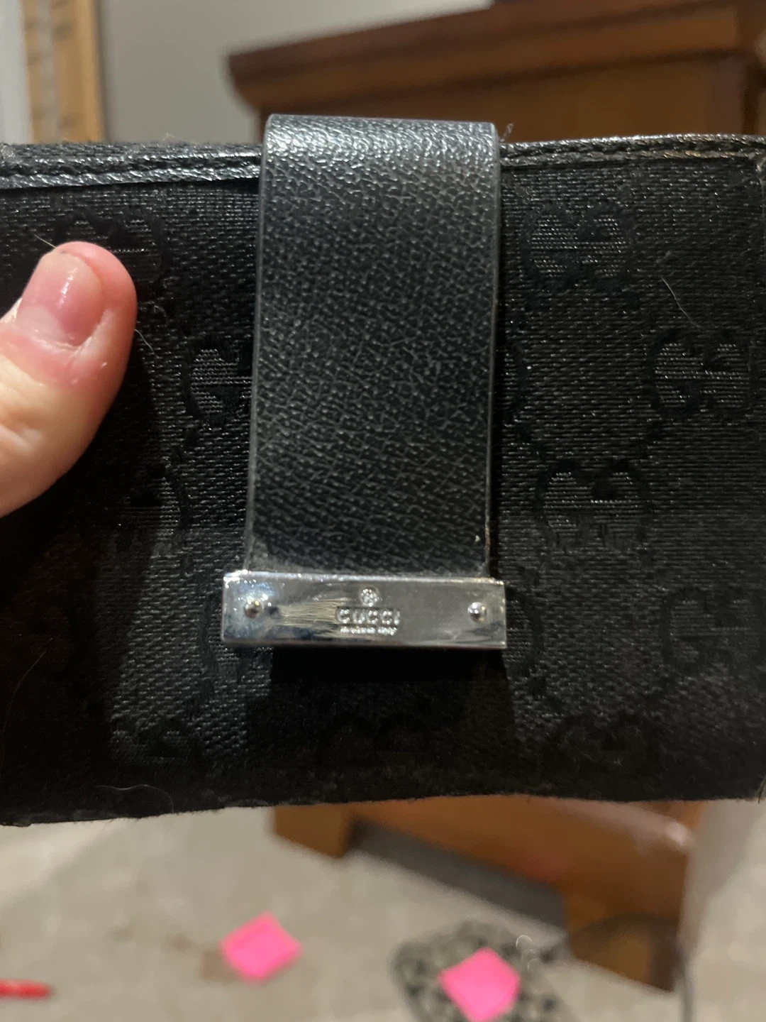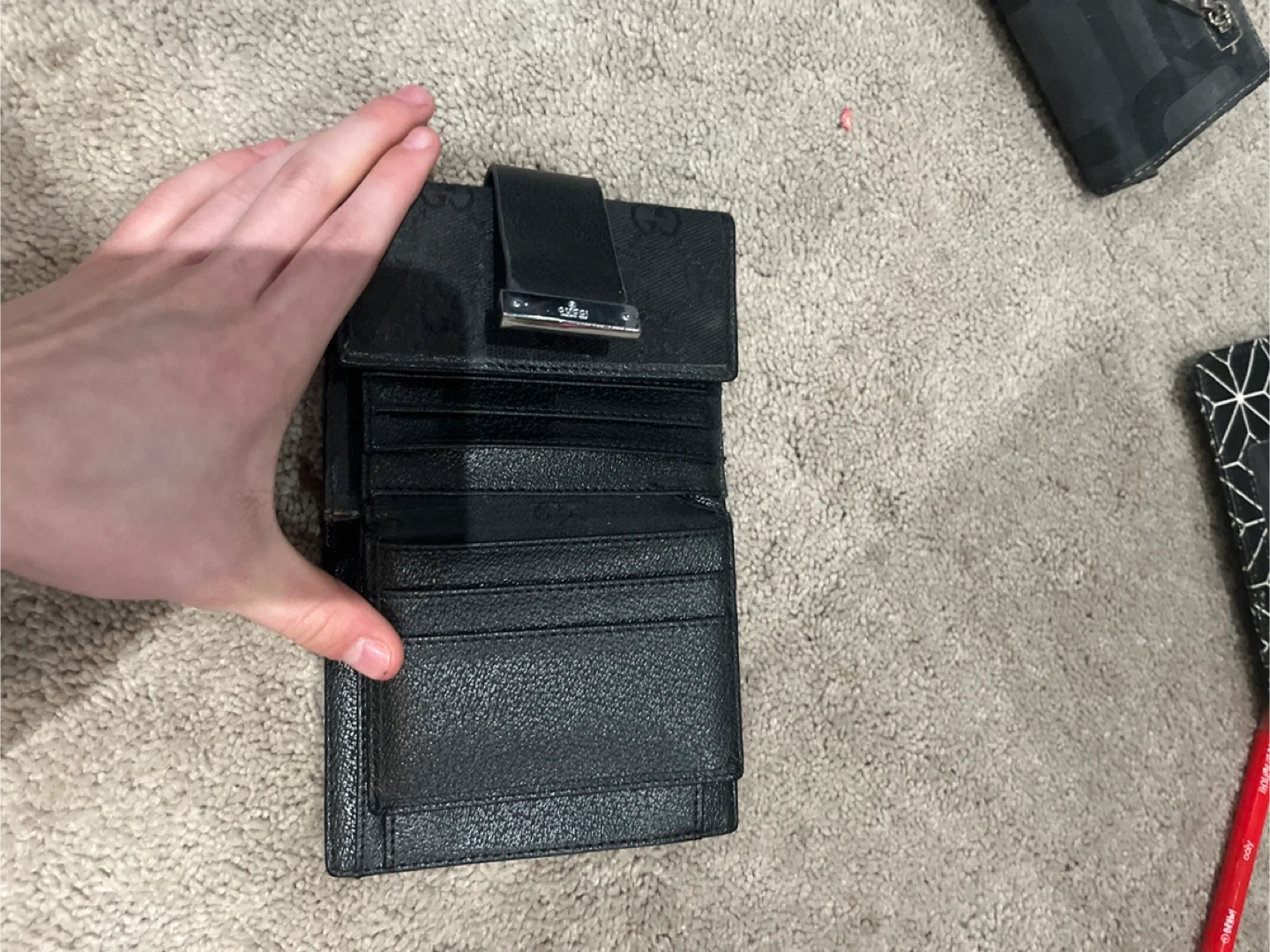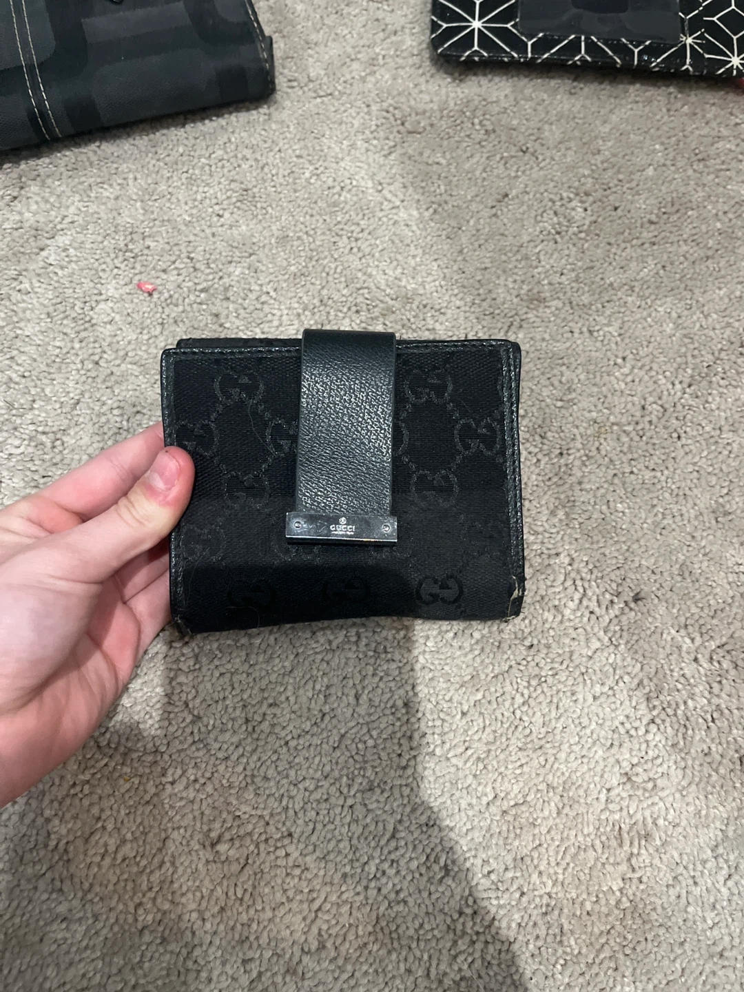 This black Gucci wallet features the iconic GG monogram canvas. It's a bifold style with multiple card slots and a clear ID window. Leather trim and a snap closure complete the look.