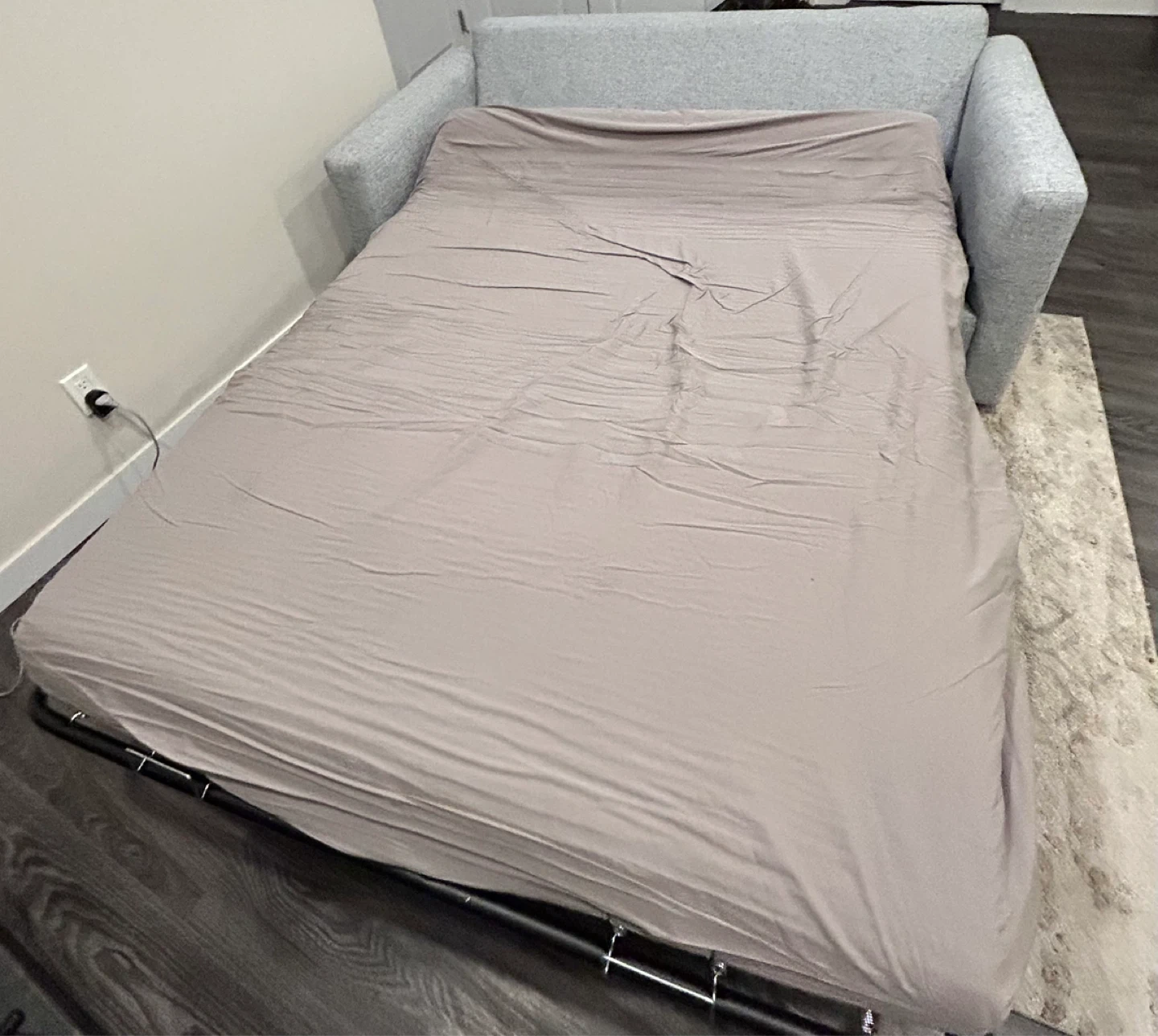 A grey sofa with a double pull-out mattress frame. Perfect for small spaces needing extra sleeping arrangements, simple to use, easy to set up and fold back, in great shape. Priced to sell fast.