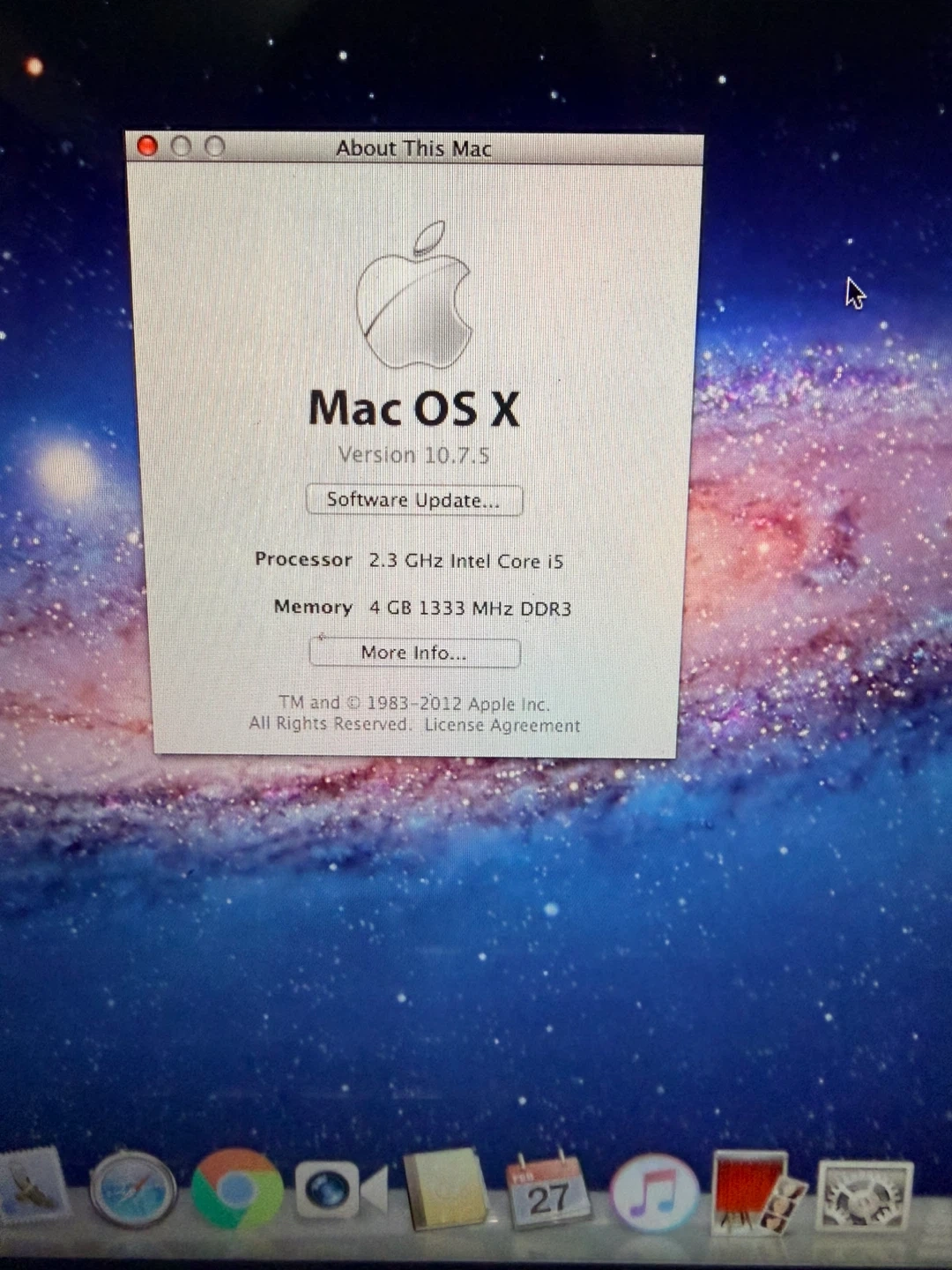 MacBook Pro running Mac OS X 10.7.5. It's powered by a 2.3 GHz Intel Core i5 processor with 4 GB of 1333 MHz DDR3 memory. Good working condition no problem