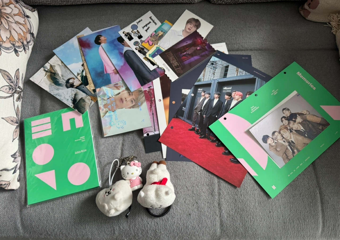 Giving away a various BTS pictures, photocards, a Hello Kitty keychain, and two RJ plush keychain & hair tie.