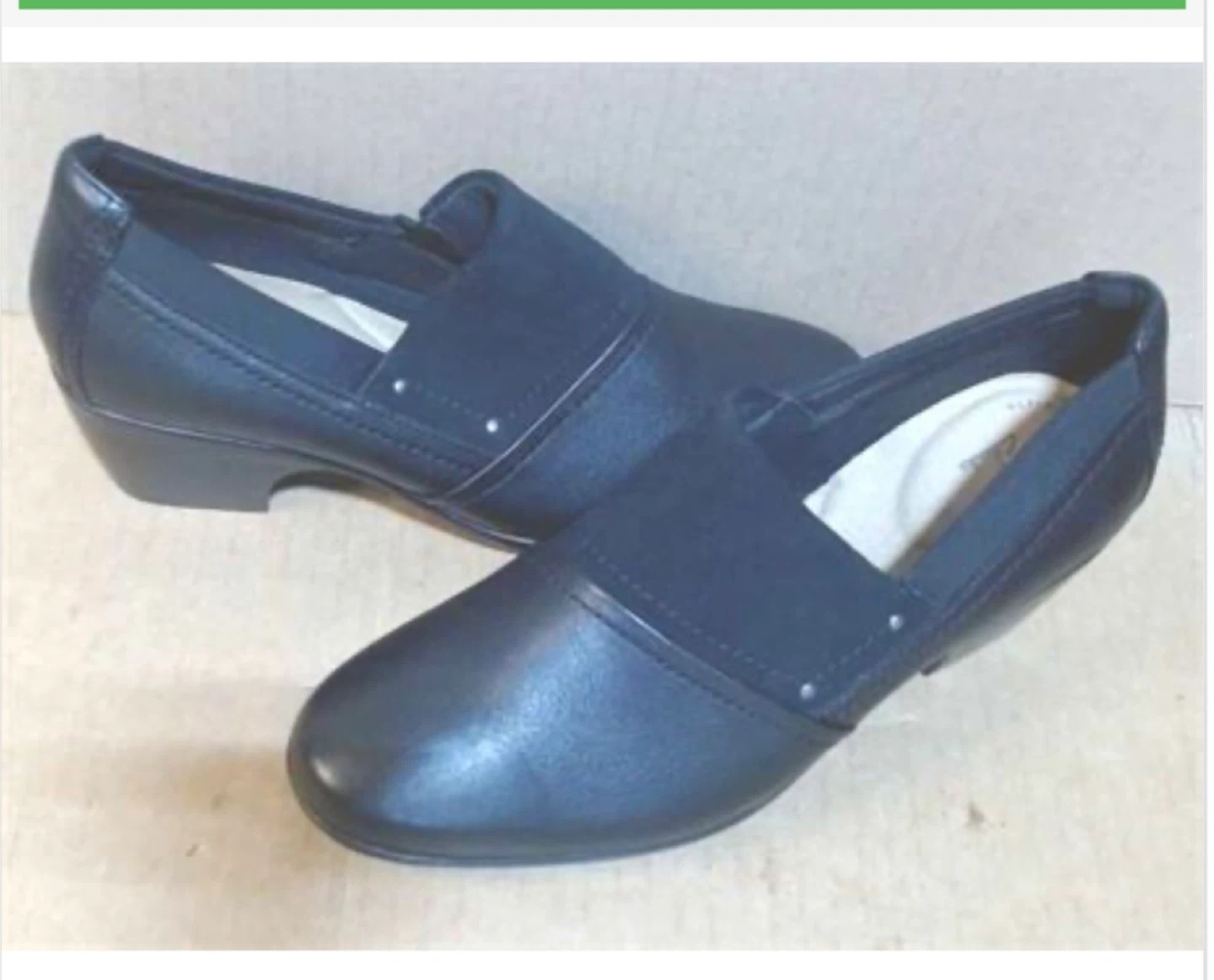Selling a pair of Clarks black leather slip-on shoes. These are new and perfect for everyday wear. They feature a comfortable design with elastic detailing.