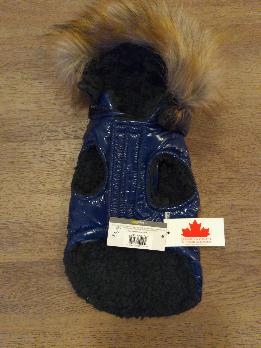 This navy blue puffy dog jacket is a size small. It features a shiny, water-resistant outer shell and a soft, furry lining. It has a hood with faux fur trim and zippered pockets. Designed in Canada, it's perfect for keeping your canine companion warm and stylish during cooler weather!