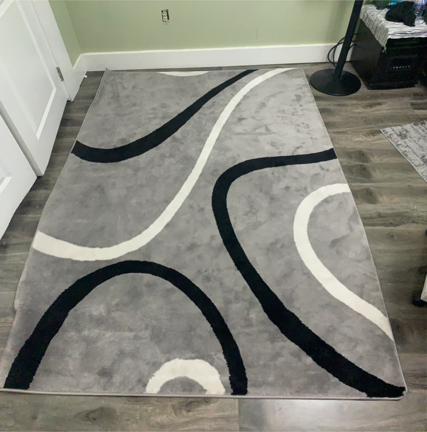Area rug with a modern design featuring black and white curved lines on a grey background. It's in great shape and would look lovely in any room