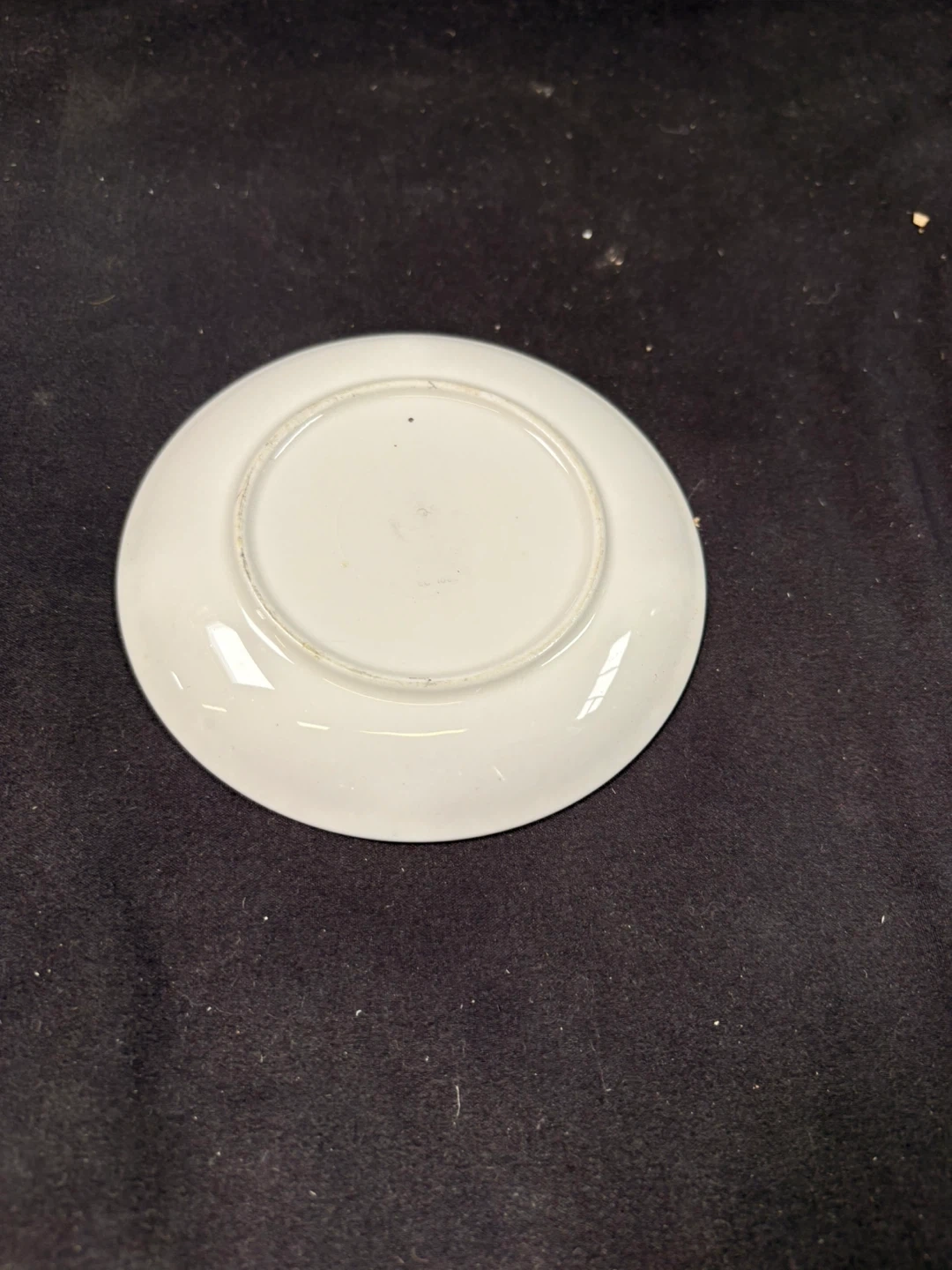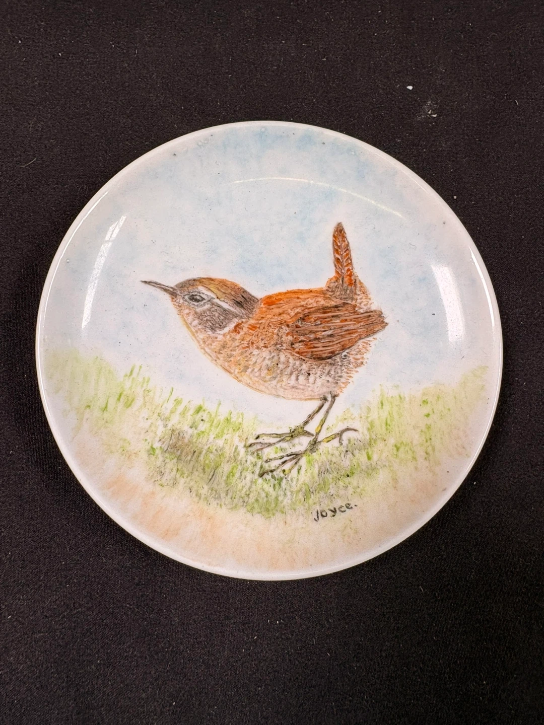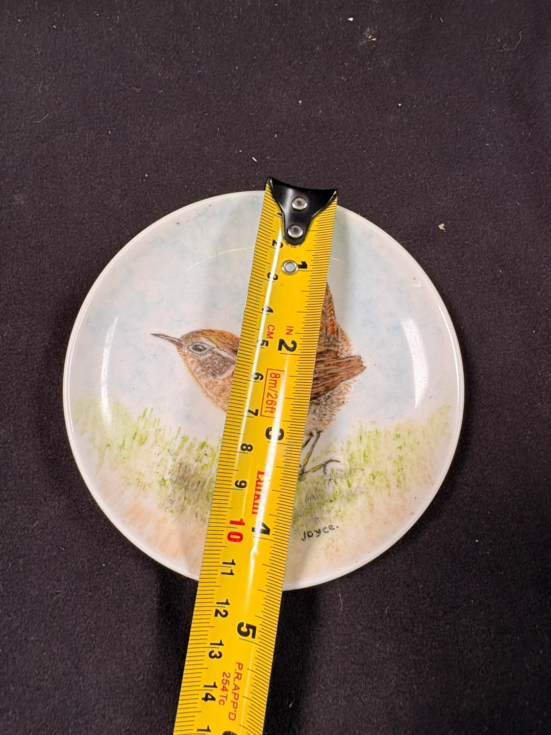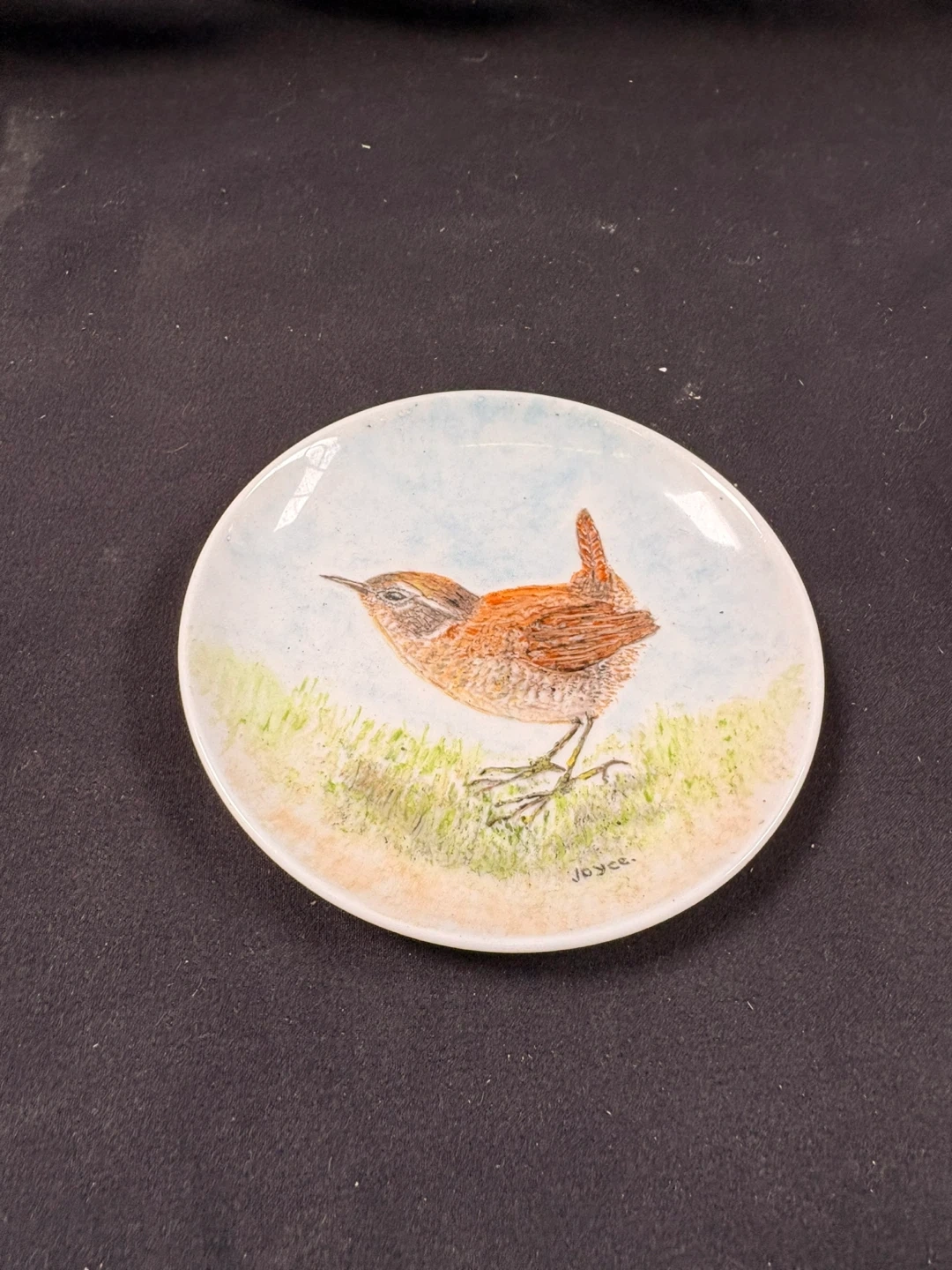 This is a small, round ceramic dish featuring a charming hand-painted wren. The artist's signature 'Joyce' is visible. It's approximately 4 inches in diameter. A lovely piece for display or to hold small trinkets!