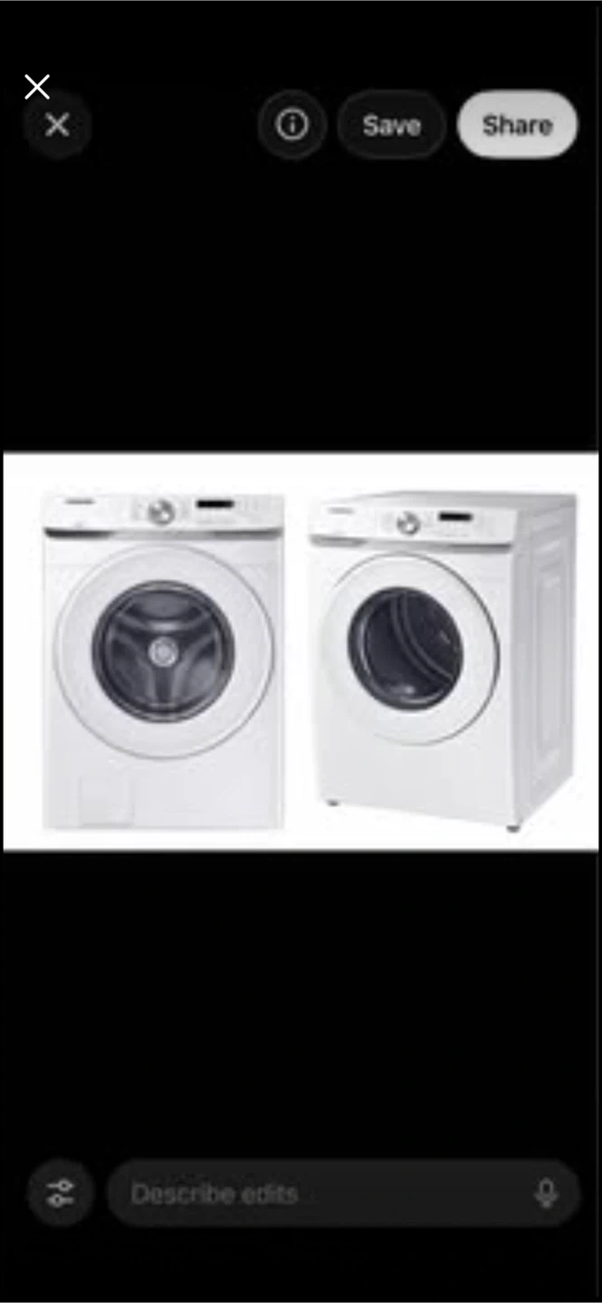 This is a white Samsung 7.5 cu ft electric dryer. Model DVE45T6000W. It's a front-load dryer, New Samsung 4.5 Cu Ft Washer
