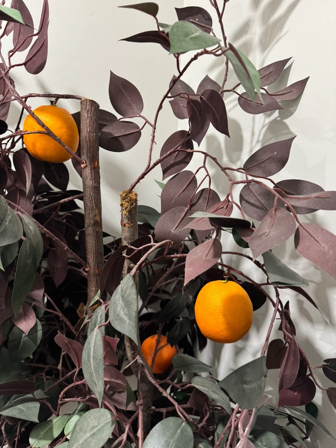Here's a lovely artificial orange tree in a basket! It's perfect for adding a touch of greenery to any room without the hassle of maintenance. The oranges add a pop of colour and the basket gives it a rustic charm
