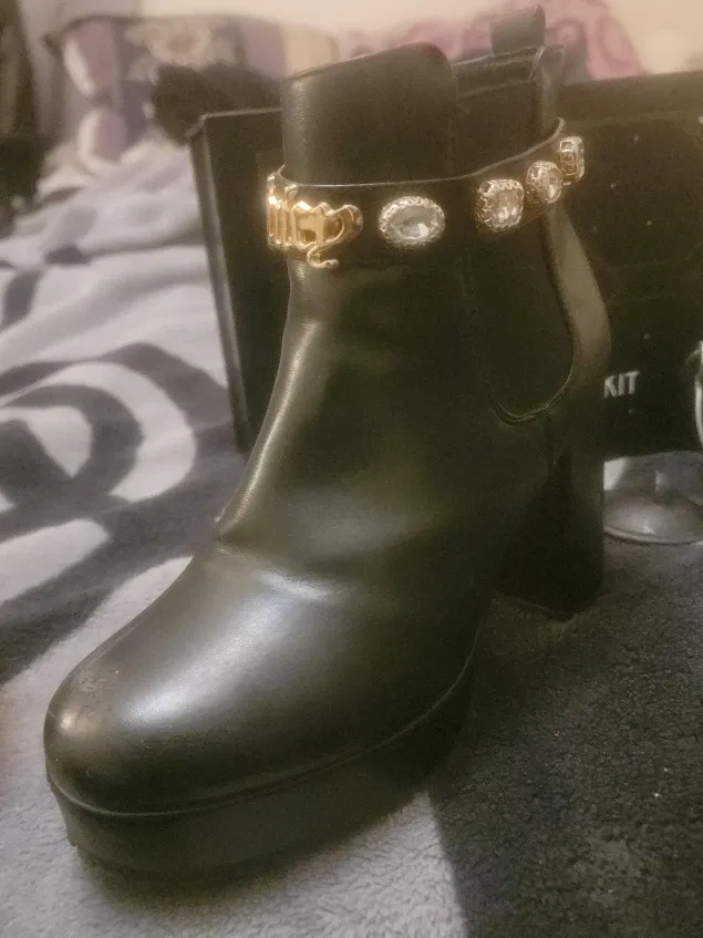 Selling a pair of black ankle BOOTS SIZE 6 from Juicy Couture! They have a cool gold chain detail with some sparkly gems. Stylish and comfy