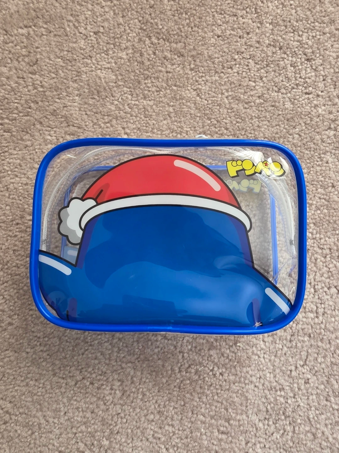 This is a clear bag featuring the Donki penguin wearing a Santa hat (the Japanese famous store). ***The zipper is broken.***. It's mainly for storing makeup or small stuffed toy.