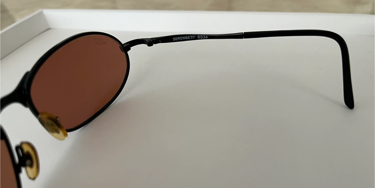 Serengeti sunglasses with brown lenses and a black frame. The model number 6534 is visible on the arm. Includes a black Serengeti hard case.