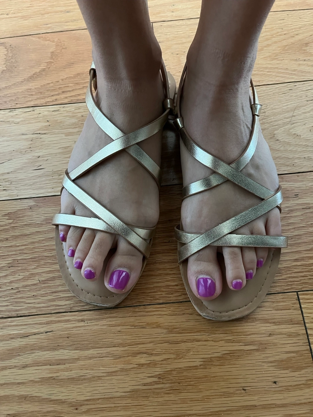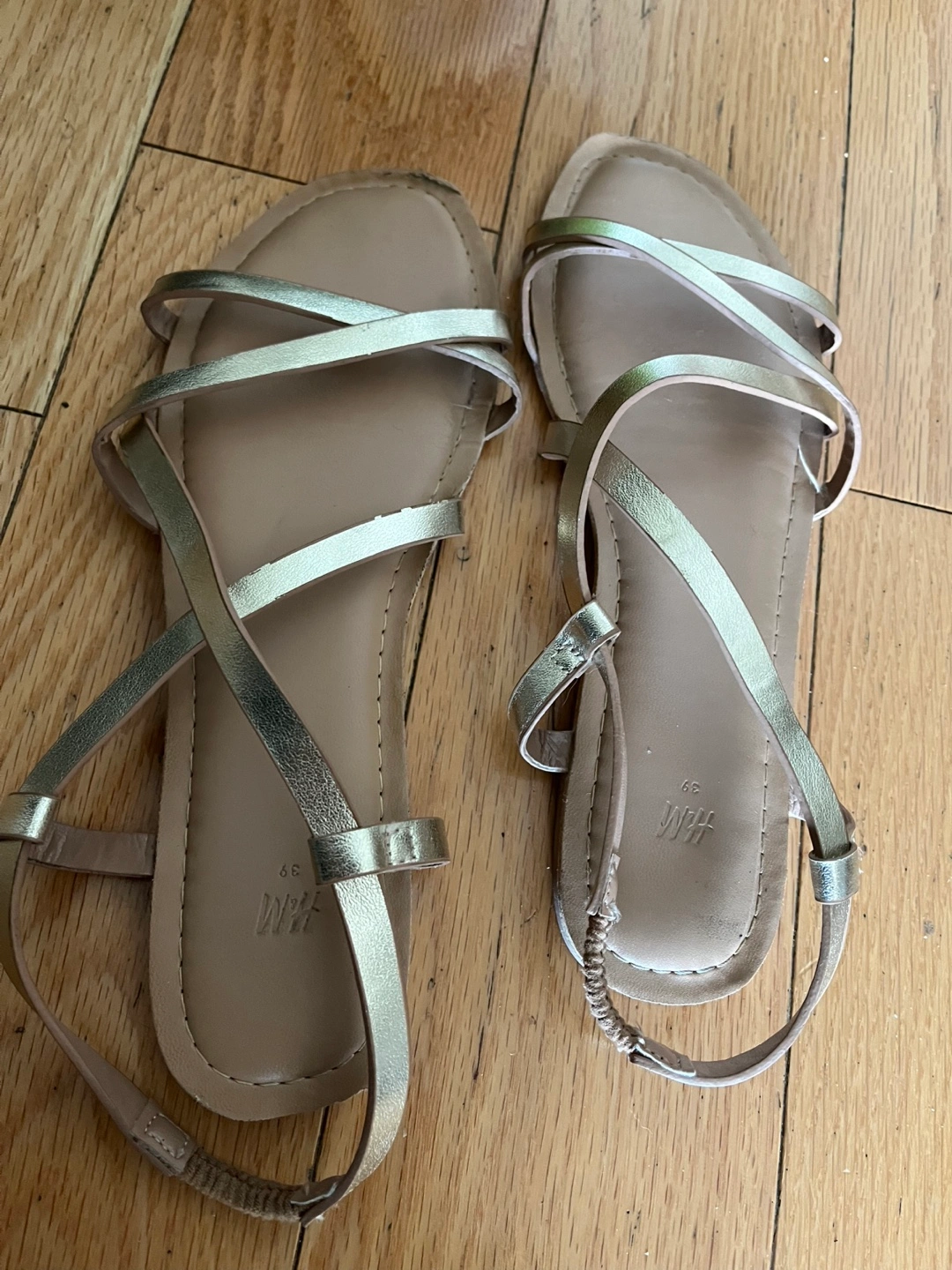 Sandals in a gold colour with crisscross straps. Buckle closure on the ankle strap.Size 39 - will fit an 8.5-9 size