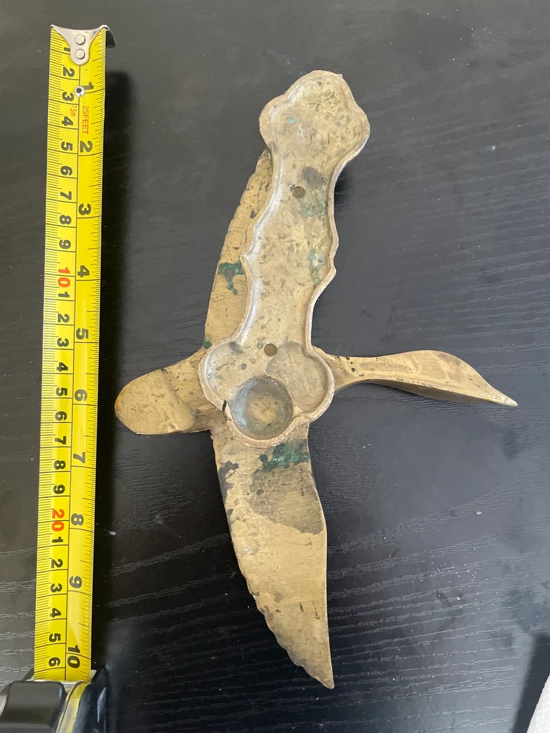 This is a solid brass decorative piece shaped like a flying duck. It measures 10 inches wingspan. The brass shows some patina and age, adding to its vintage charm. This piece would make a lovely addition to a wall or door.