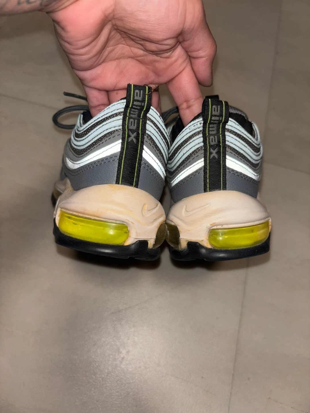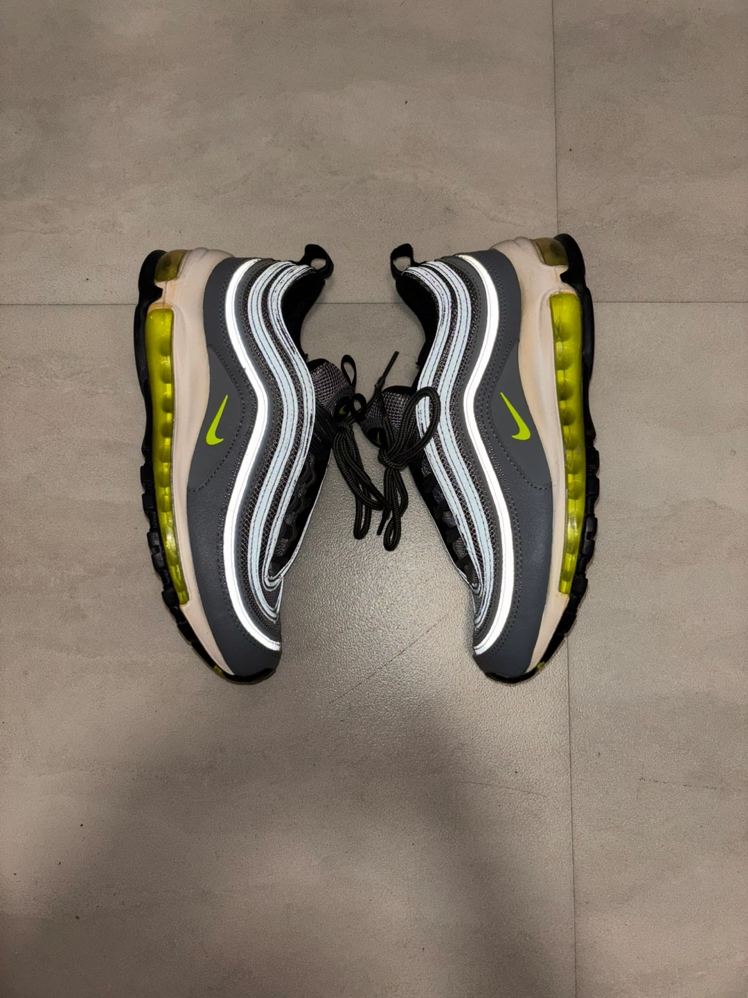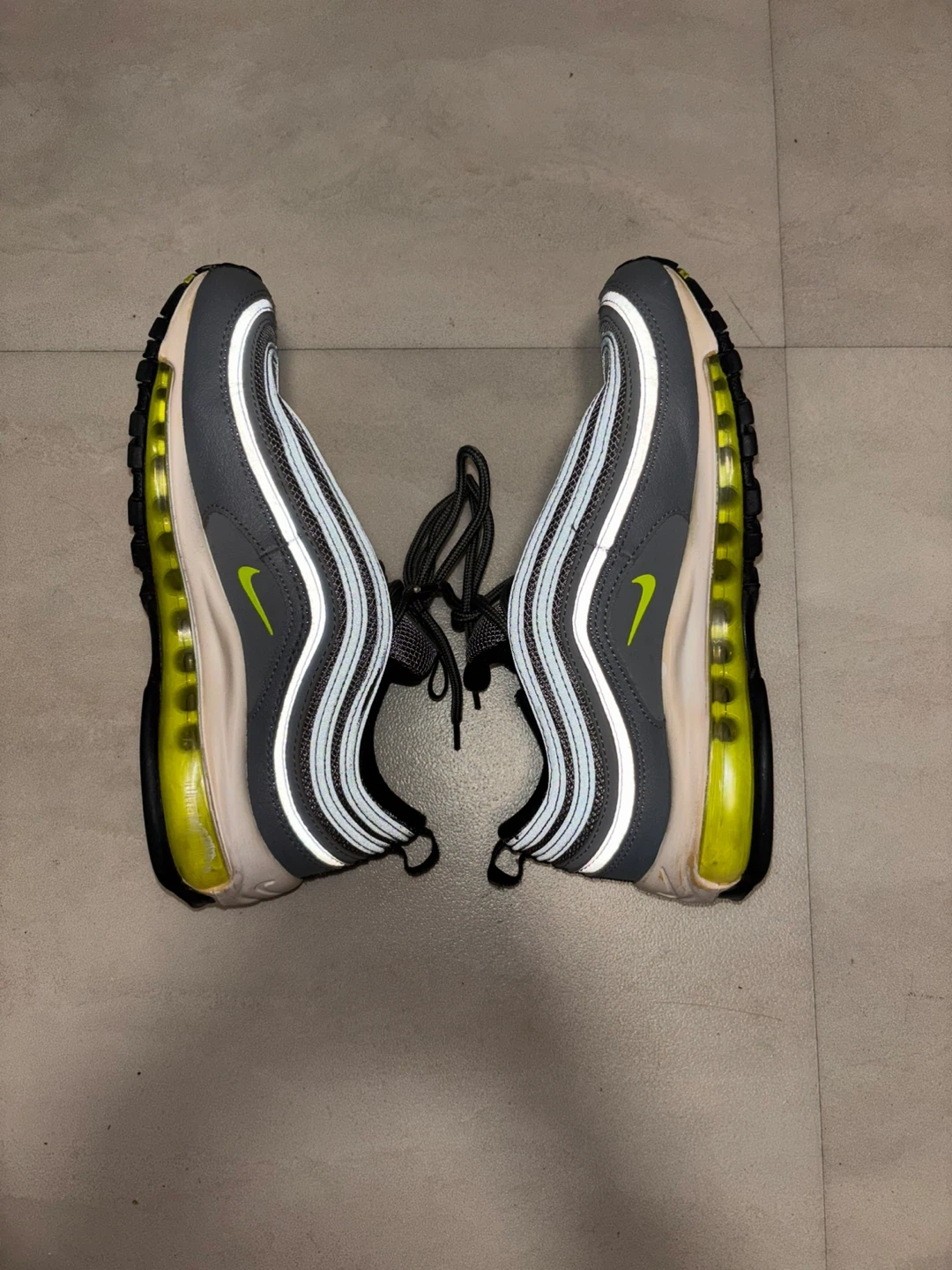These are Nike Air Max 97 sneakers in the "Volt" colorway. They feature the iconic wavy design lines and visible Air cushioning. Rubber sole for durability. A classic running shoe design. Missing inside soles.