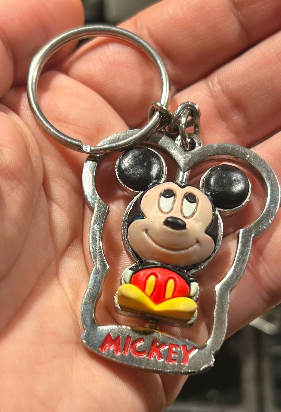 This is a fun Mickey Mouse keychain with a metal frame. It features Mickey in his classic red shorts and yellow shoes. It's a great accessory for any Disney fan!