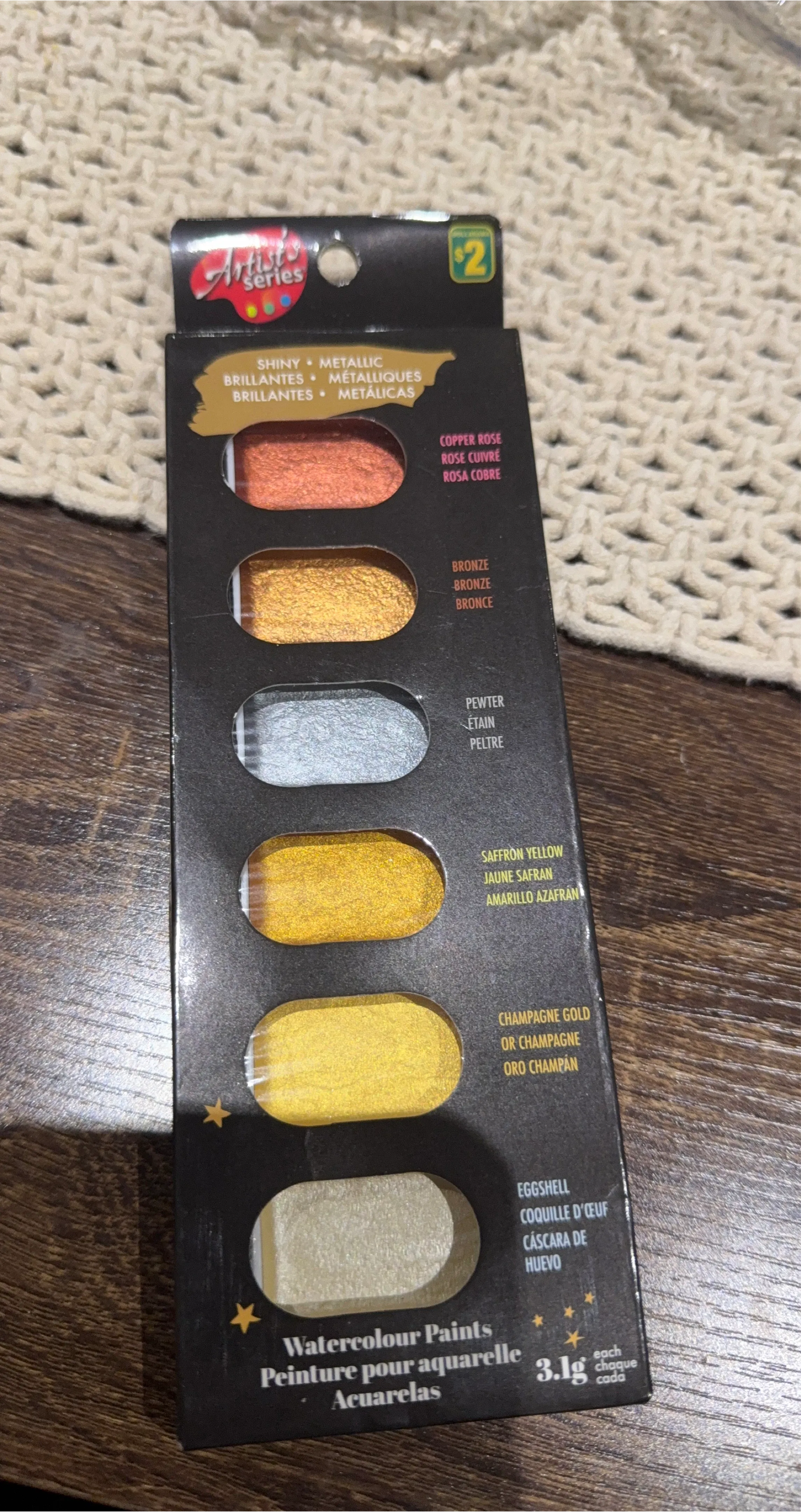 Selling a brand new set of Artist Series metallic watercolour paints. This set includes six vibrant, shiny metallic colours: copper rose, bronze, pewter, saffron yellow, champagne gold, and eggshell. Perfect for adding a touch of shimmer to your art projects!
