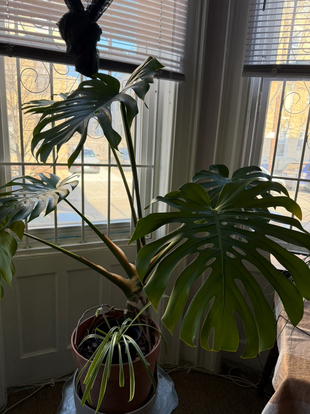 Healthy Monstera Deliciosa plant with large fenestrated leaves. The largest leaf measures approximately 18 inches across. Comes in a terracotta pot with a spider plant as a companion. A beautiful addition to any indoor space!