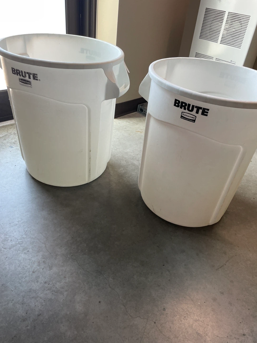 Two white Rubbermaid Brute 32-gallon trash cans. These heavy-duty cans are made of durable plastic. They're great for garages or workshops!