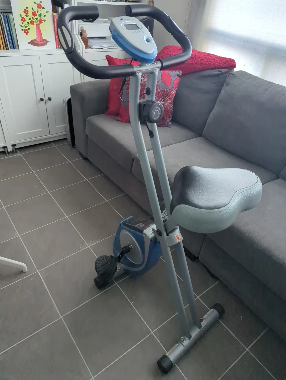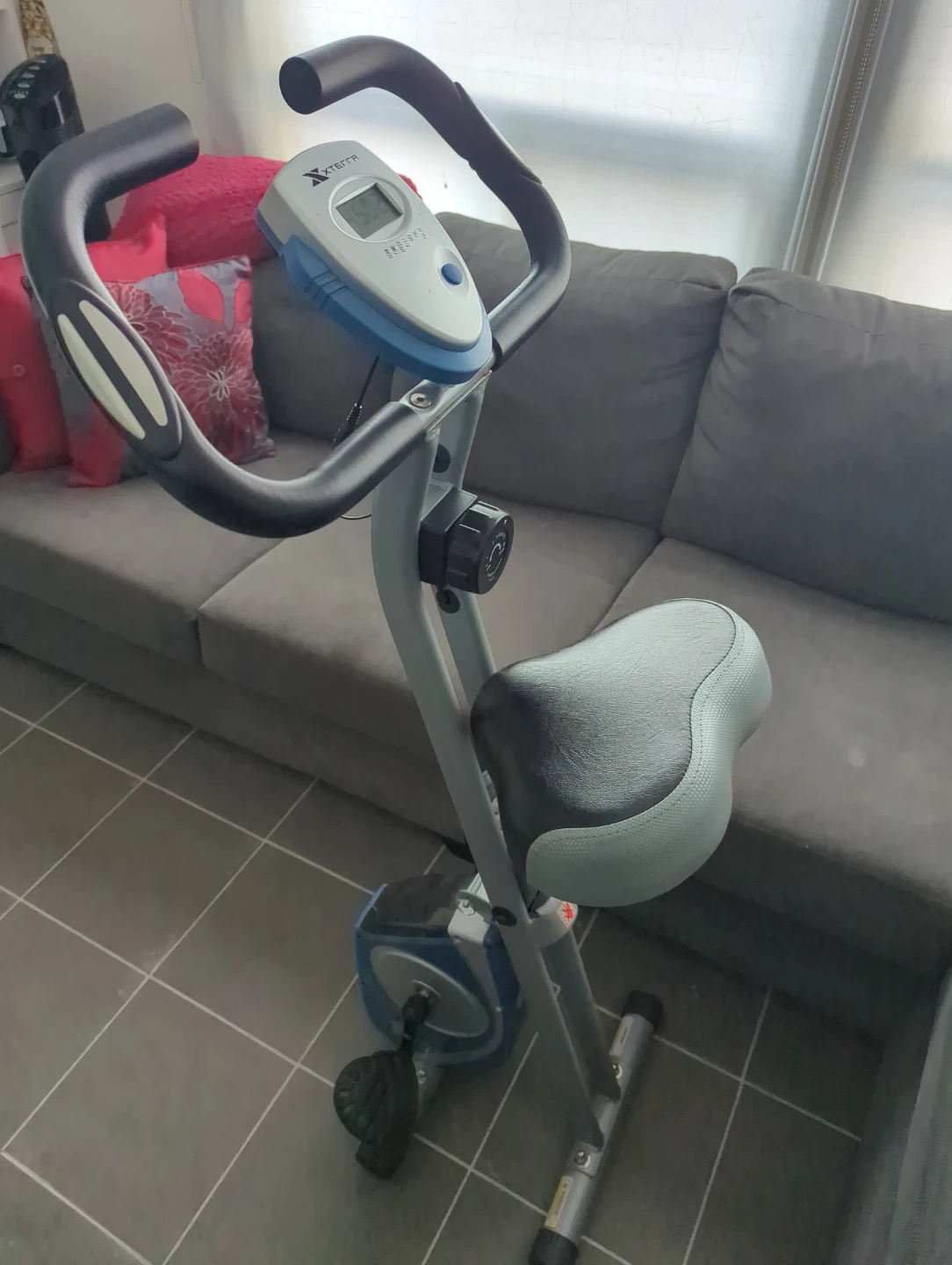 This XTERRA stationary exercise bike features a digital display showing time, speed, distance, and calories burned. It has adjustable resistance for a customized workout. The seat is padded for comfort. This bike's compact design makes it suitable for home use.