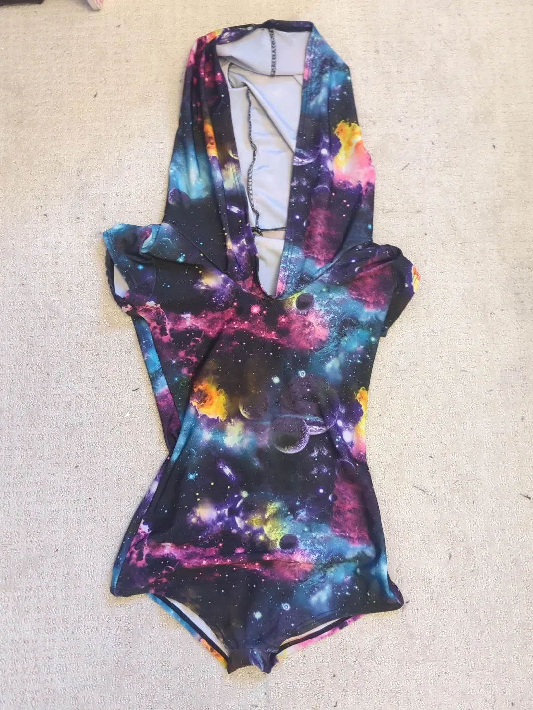 This hooded onesie features a vibrant galaxy print with planets and nebulae. It's made from a stretchy, comfortable material.