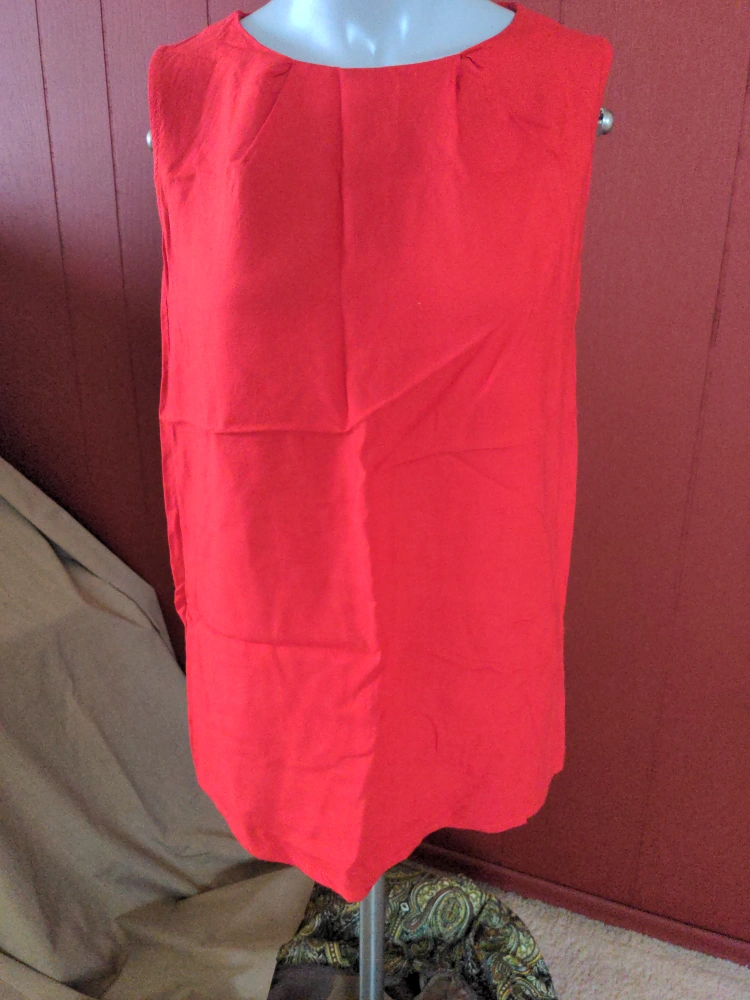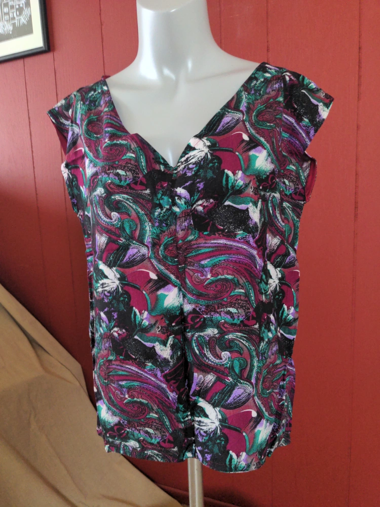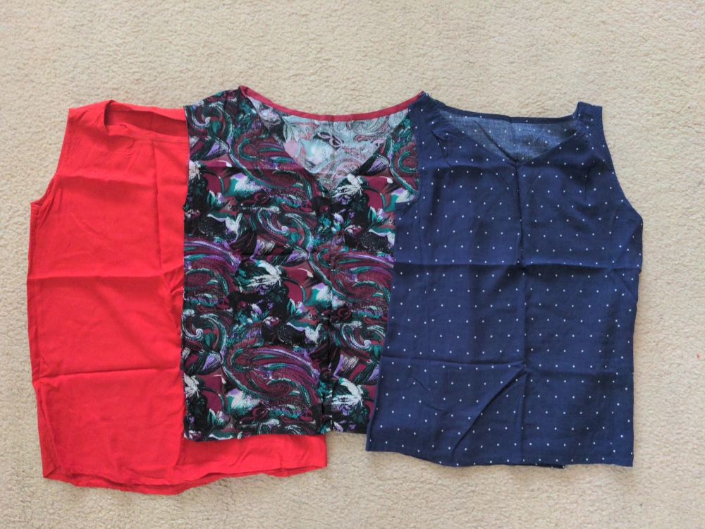 Three women's cotton sleeveless tops: a solid red textured top, a multi-coloured paisley print v-neck top, and a navy blue polka dot v-neck top. They're great for layering or wearing on warmer days.