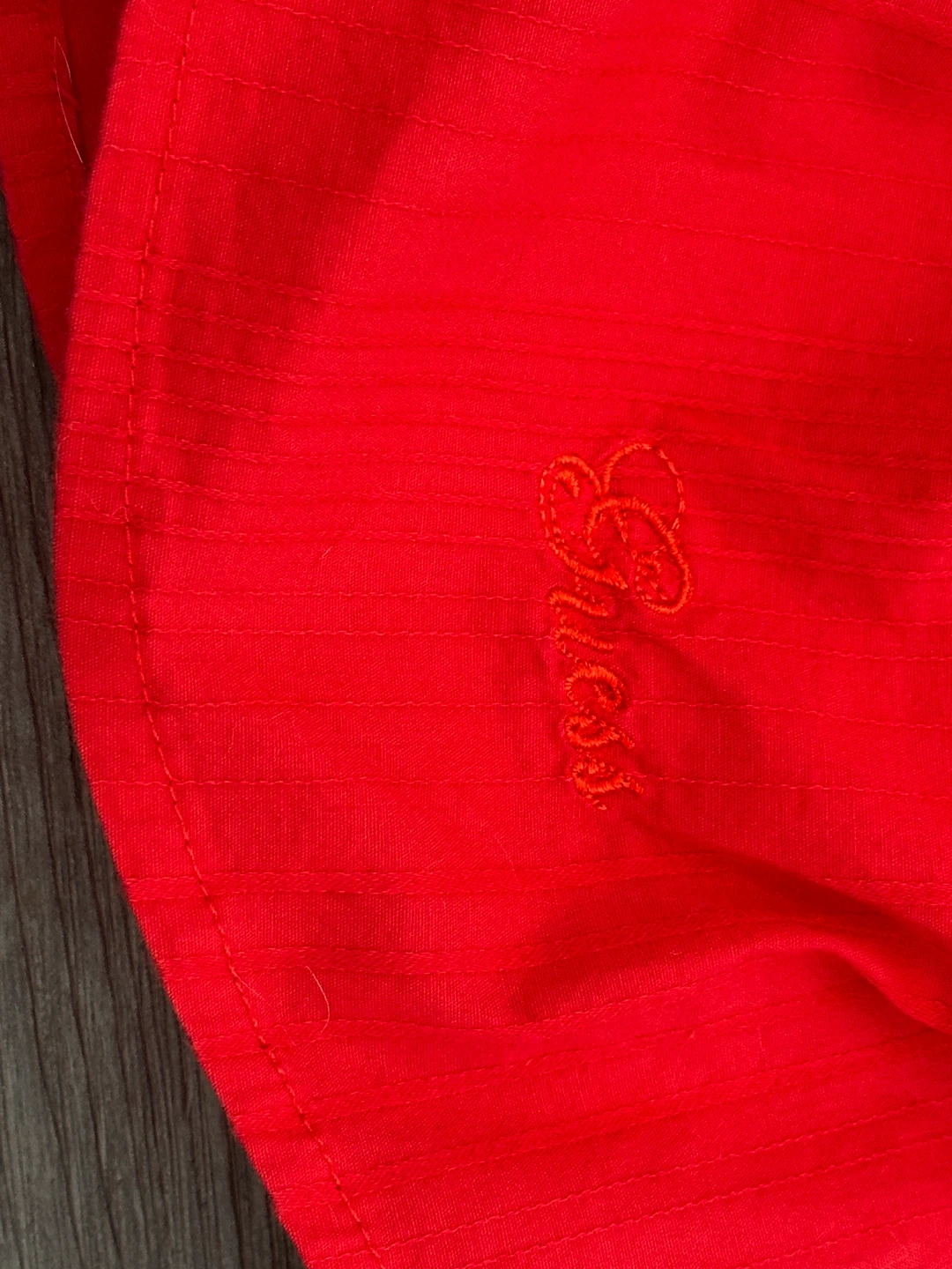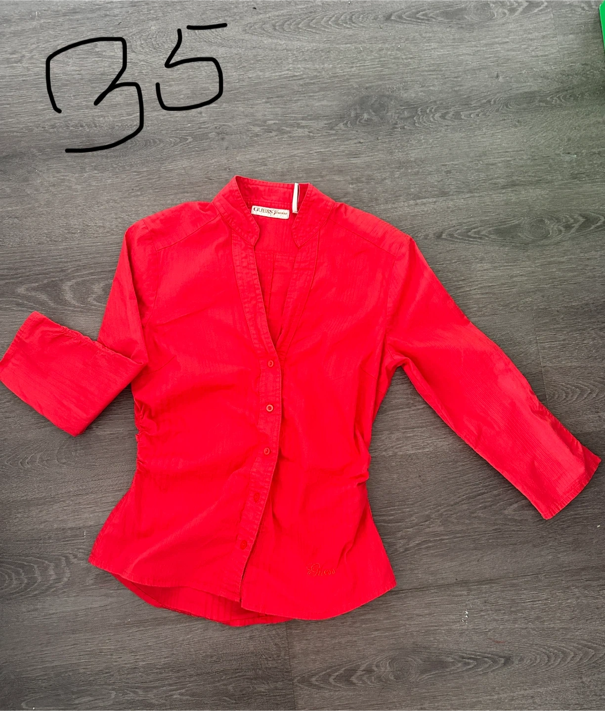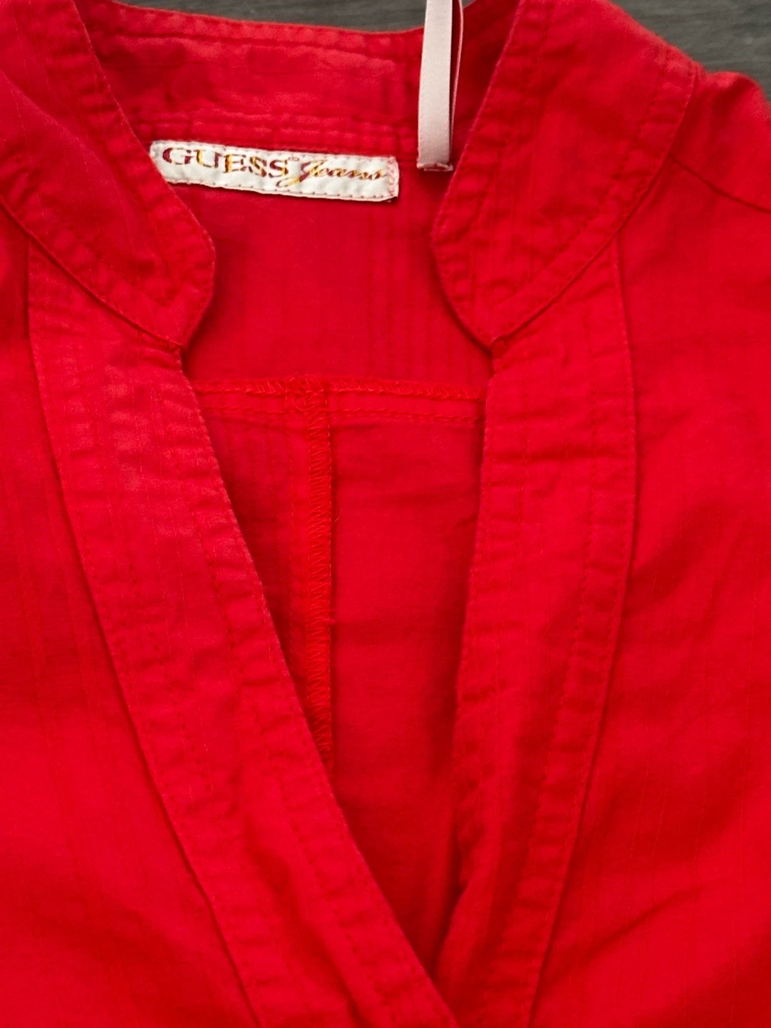 This is a red Guess Jeans button-up blouse. It's a size small and made from a comfortable fabric. The blouse has a unique collar design and a V-neckline with buttons. It's perfect for adding a pop of colour to your wardrobe!