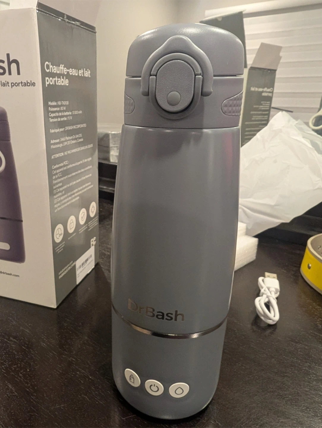 This is a Dr. Bash portable water and milk heater. It displays temperature in Fahrenheit and has multiple settings. Includes USB charging cable. Brand new