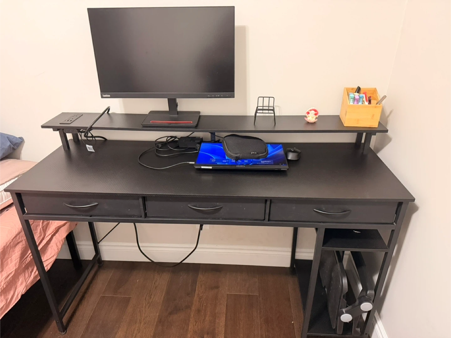 This desk has a built-in power outlet with two USB-A and one USB-C port. It's a handy addition to keep your devices charged and ready to go. The outlet is integrated into the desk surface for a clean look.