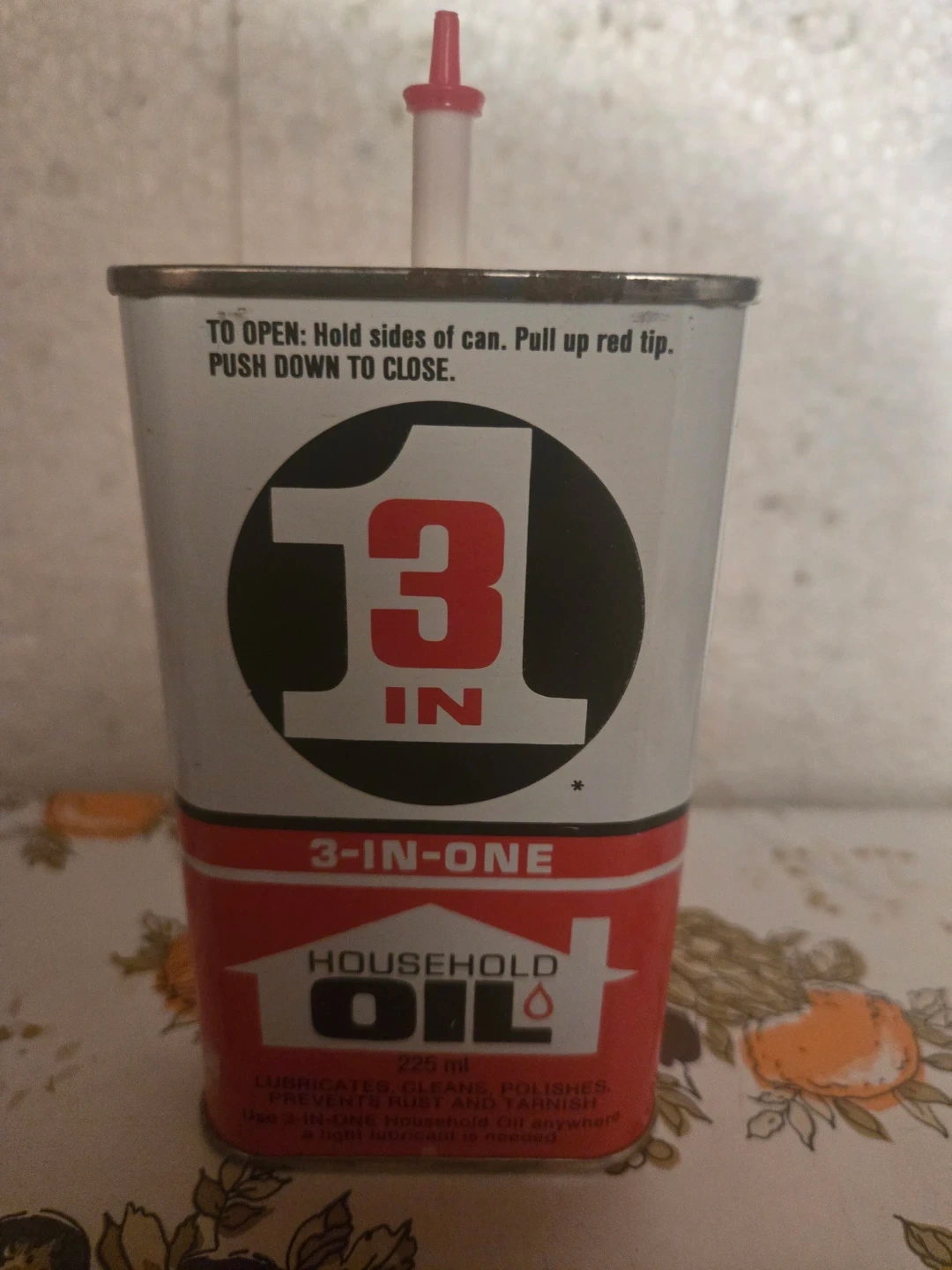 This is 3-IN-ONE Household Oil in a 225 ml can. It lubricates, cleans, polishes, and prevents rust and tarnish. It's useful for any situation where a light lubricant is needed.
