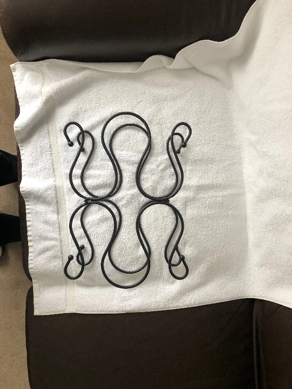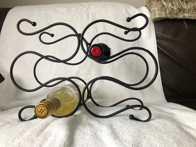 Compact black metal freestanding wine/bottle rack. Easily fits on counters, tables, in cabinets, or on top of the fridge. Holds 7 bottles. Bottles in picture not included. Dimensions: 14”W x 10”H x 5” Depth. Pickup in Brampton, near Queen and Kennedy.