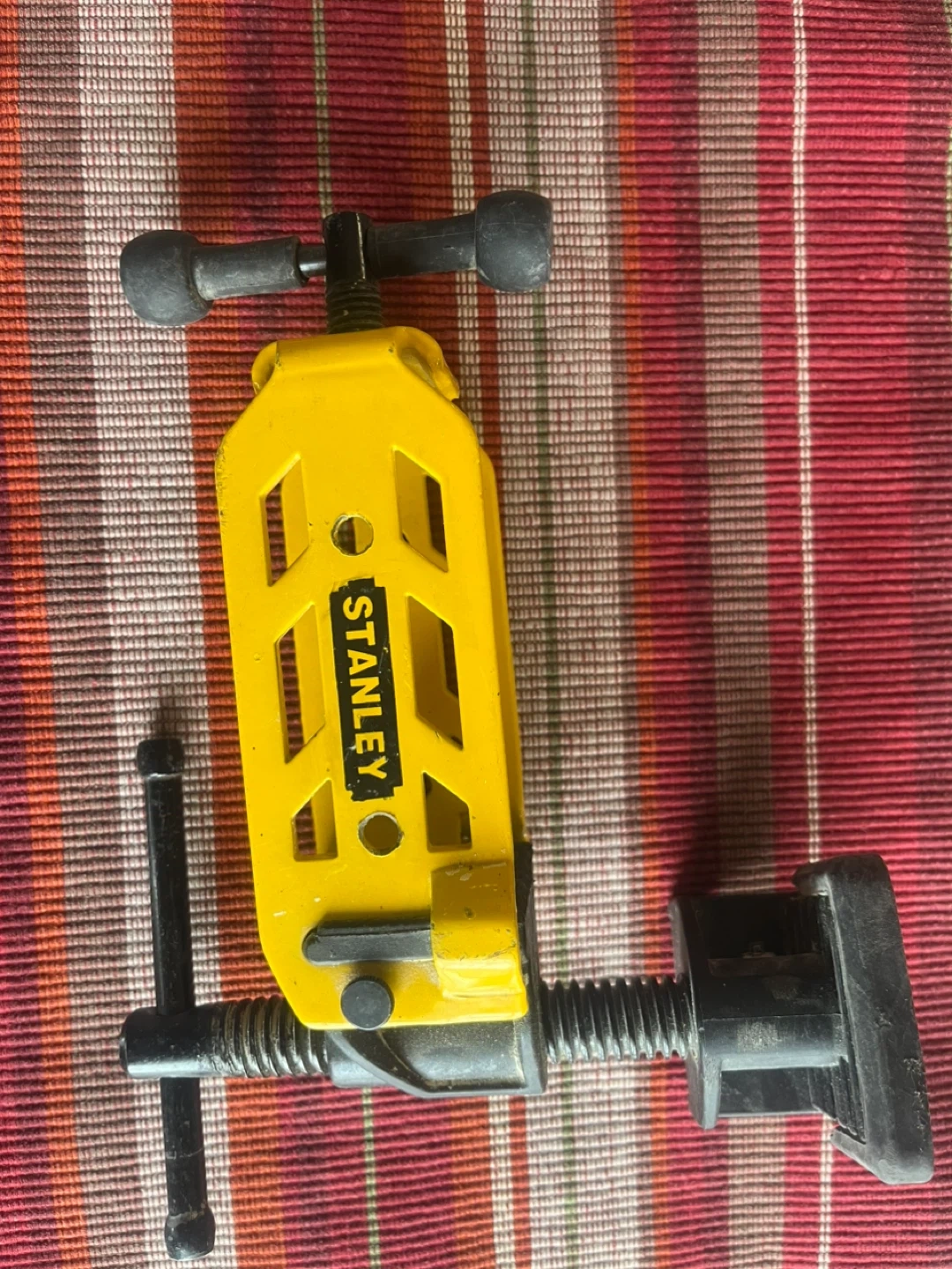 This is a yellow Stanley quick-grip bar clamp. It's made of metal and plastic components for durability. The clamp is useful for holding materials together securely during woodworking or DIY projects.