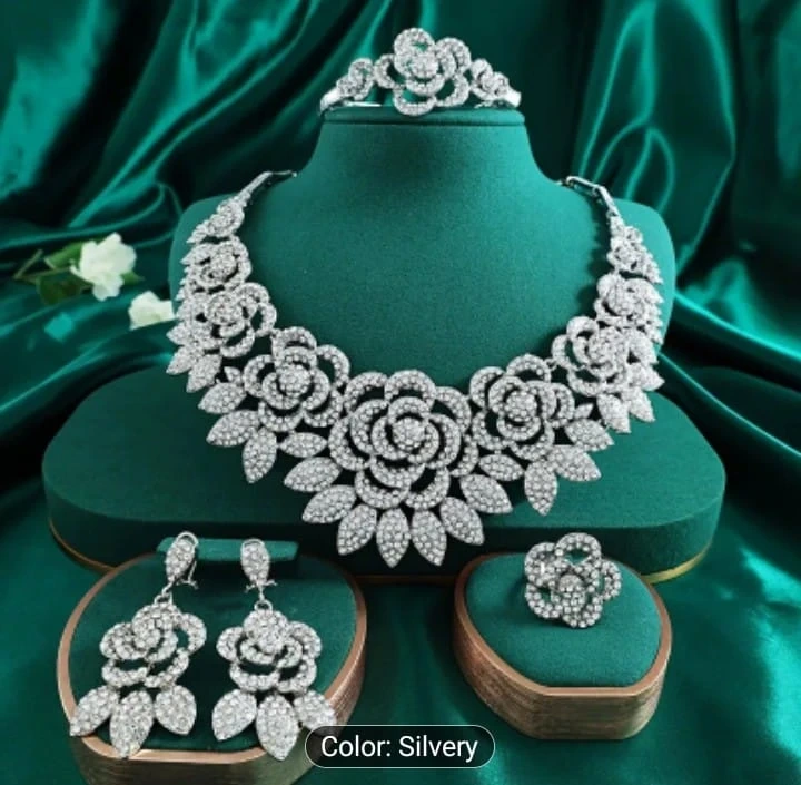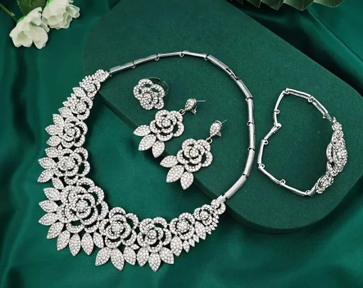 Selling a beautiful silver floral jewelry set! This set includes a necklace, ring, earrings, and a bracelet. It's in great condition and would be perfect for a special occasion or to add a touch of elegance to any outfit